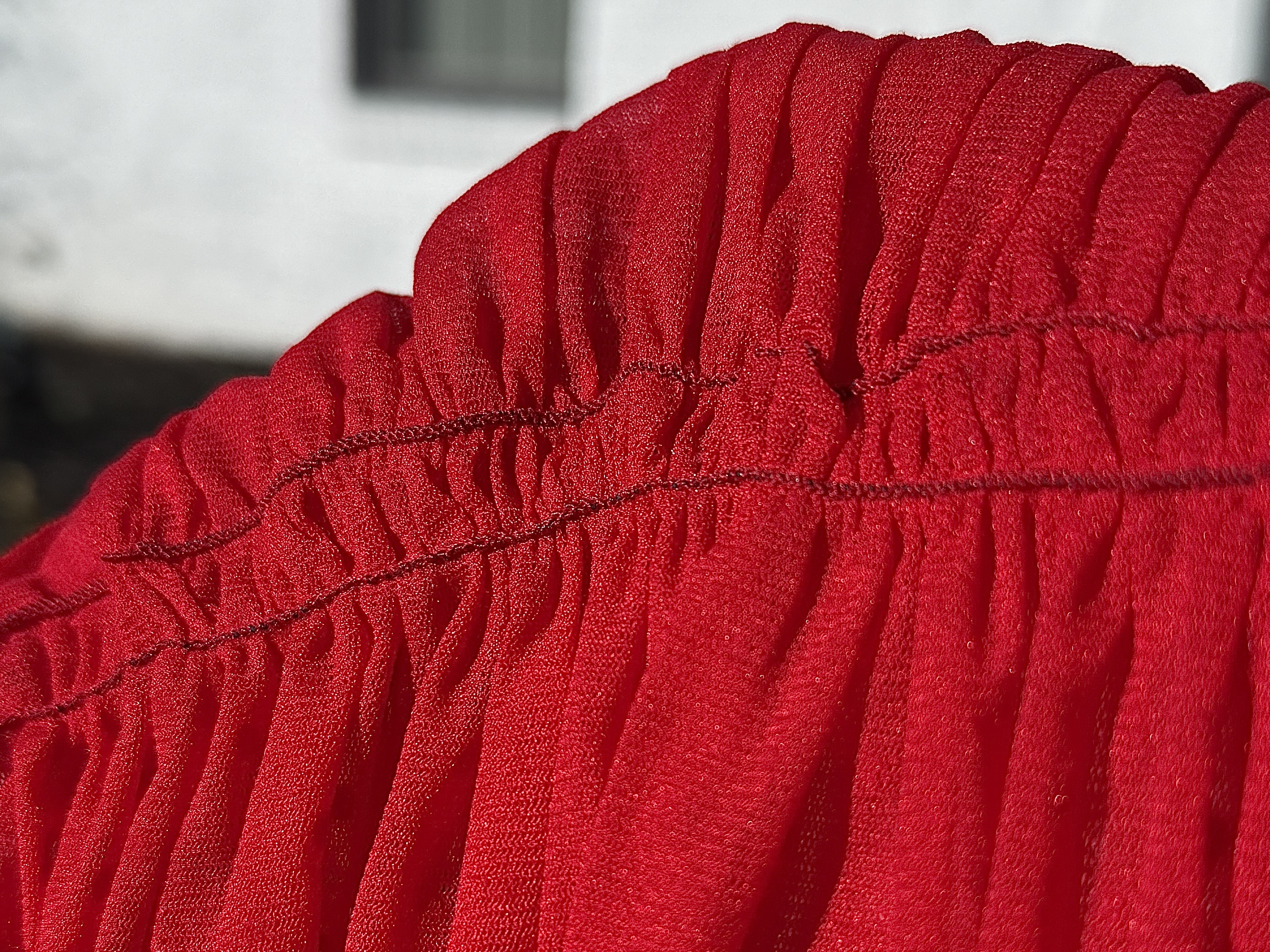 For this Simplicity S8839, I am following the guidelines on the sleeves and shirring two lines, 3/8″ apart. When you reach the end of the guideline, cut the threads and tie a knot to secure the shirring.