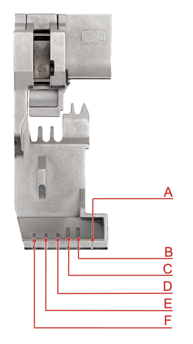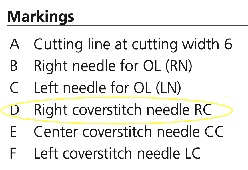 There are many markings on the Shirring Foot, but the main marking you will need to pay attention to for this project is marking D (right coverstitch needle placement). This marking will be the guideline you follow when creating your chainstitch.