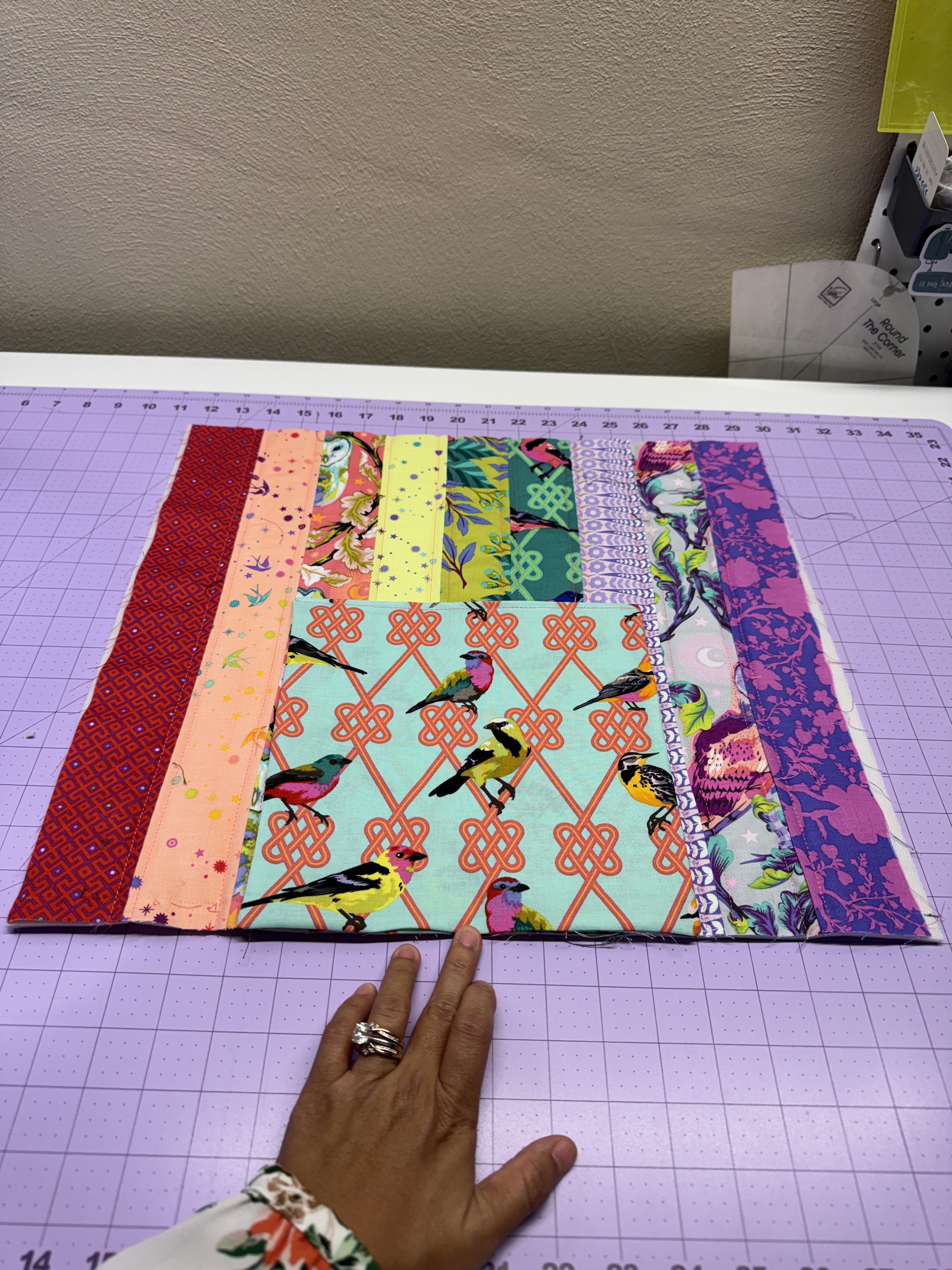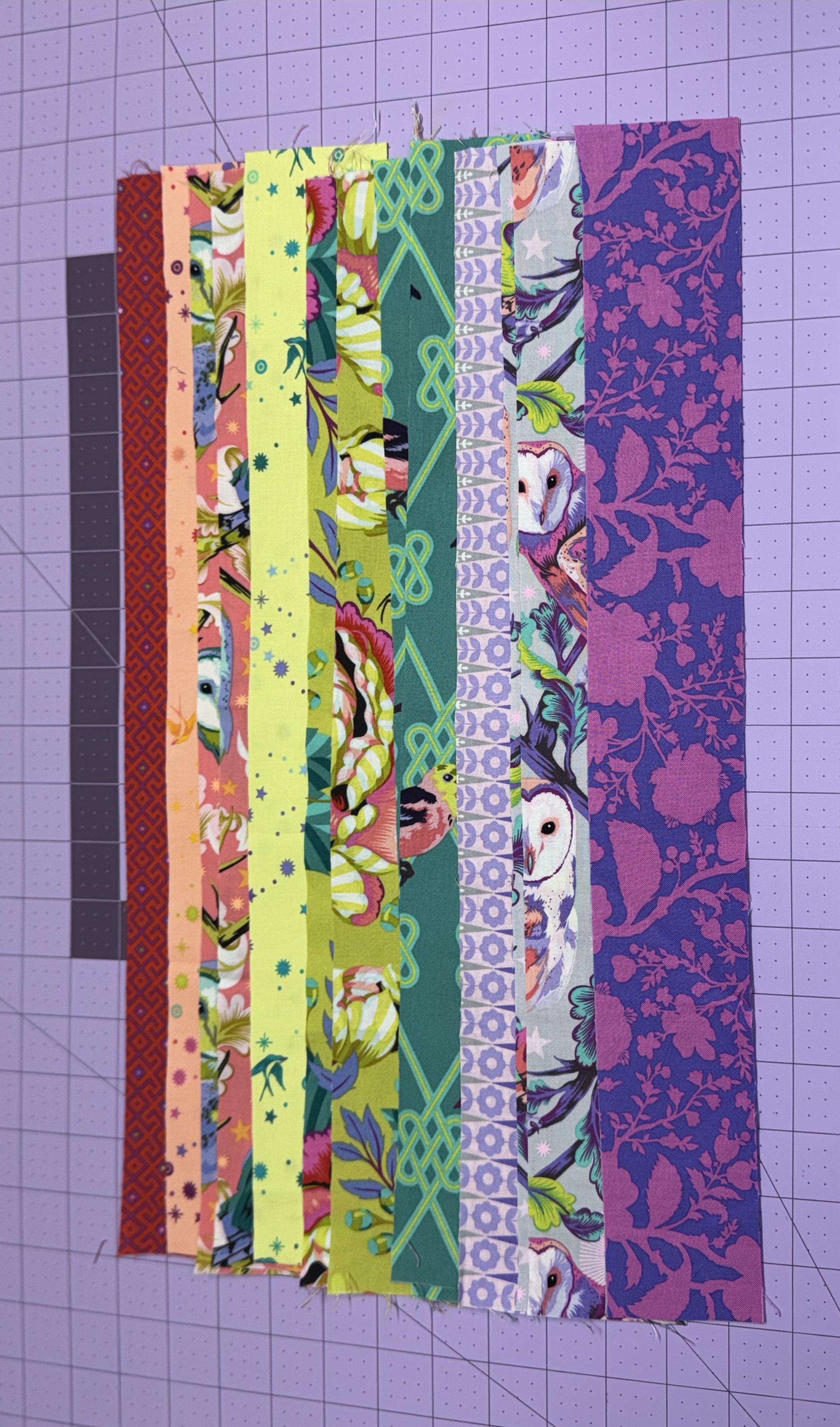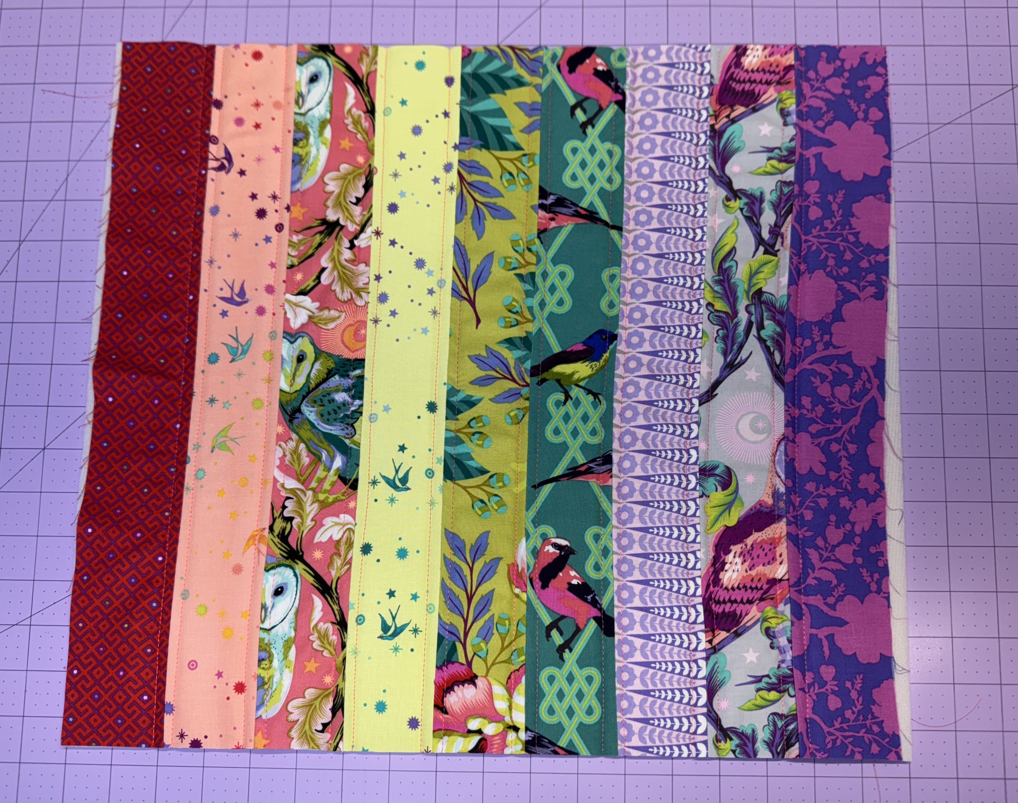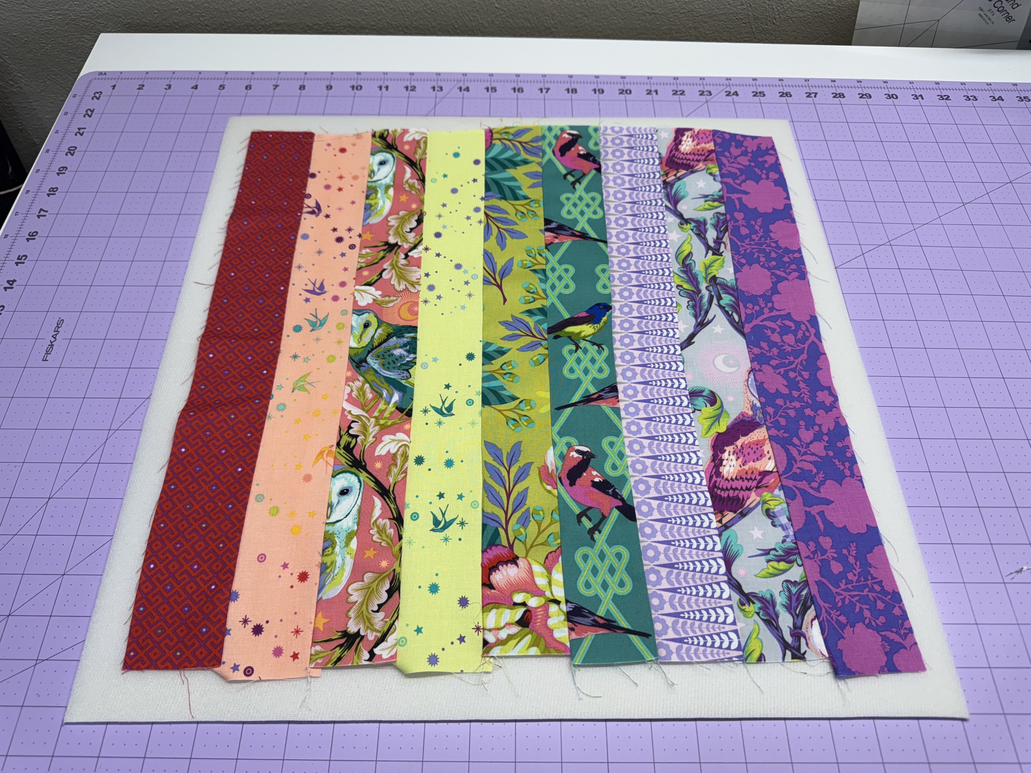 Coser las 9 tiras con los derechos enfrentados usando un margen de costura de ¼”. Planchar las costuras hacia un lado o abiertas.