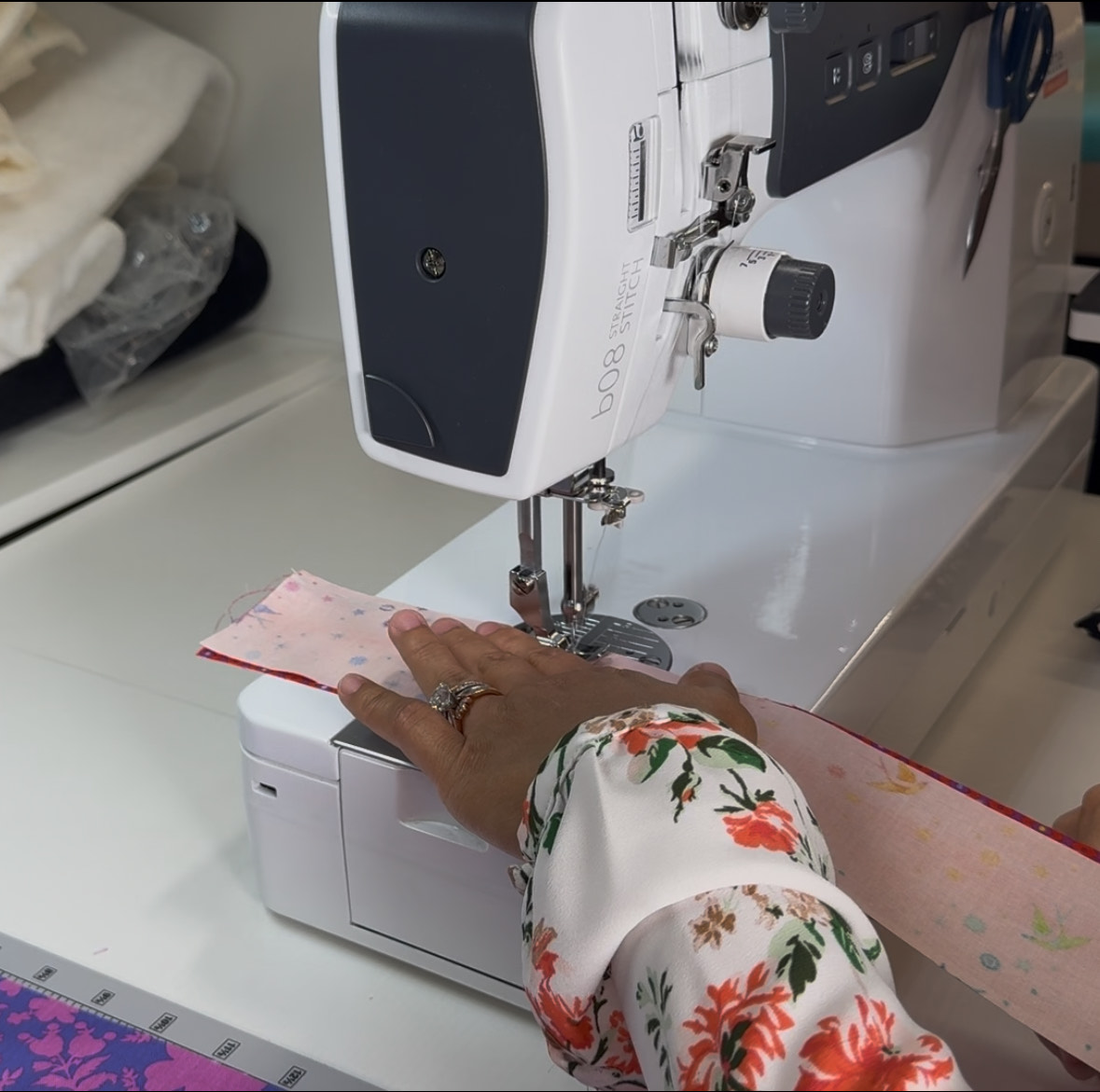 Coser la cinta a lo largo de cada lado desde la parte inferior del bolsillo hasta la marca de 4” usando un margen de costura de ⅛”.