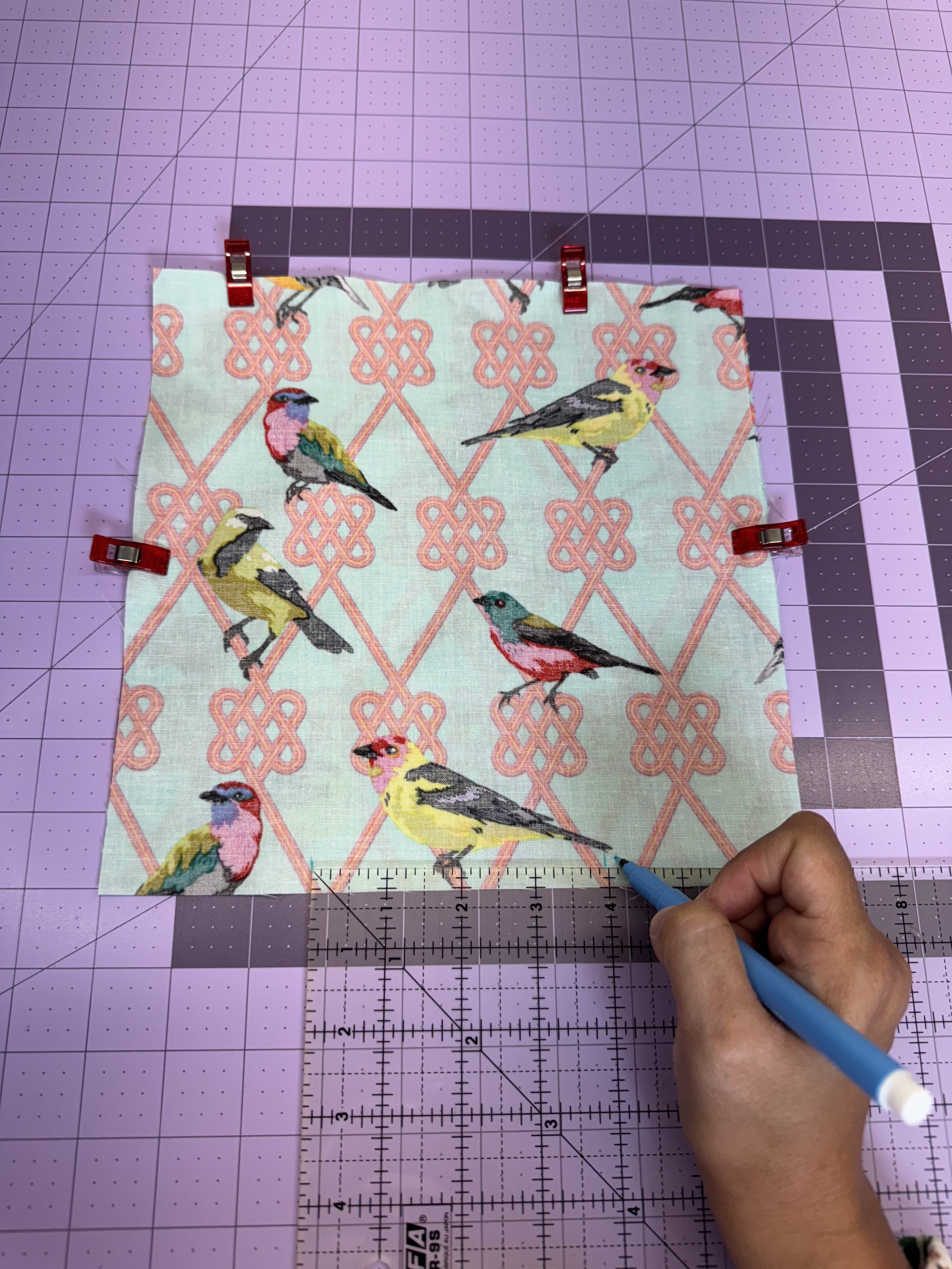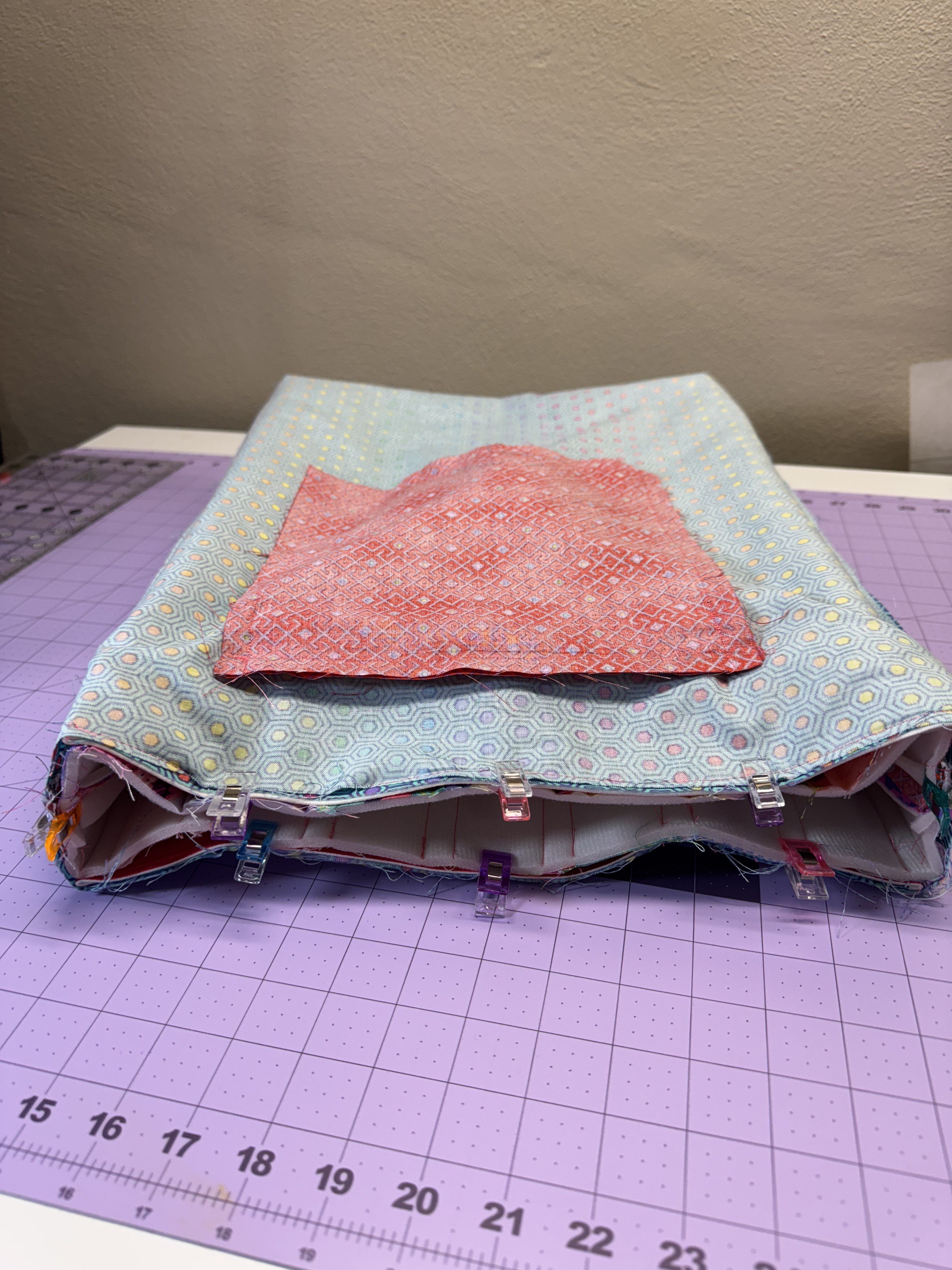 Cortar (2) cuadrados de 9” x 9” de la misma tela del forro (para el bolsillo interior con cierre).