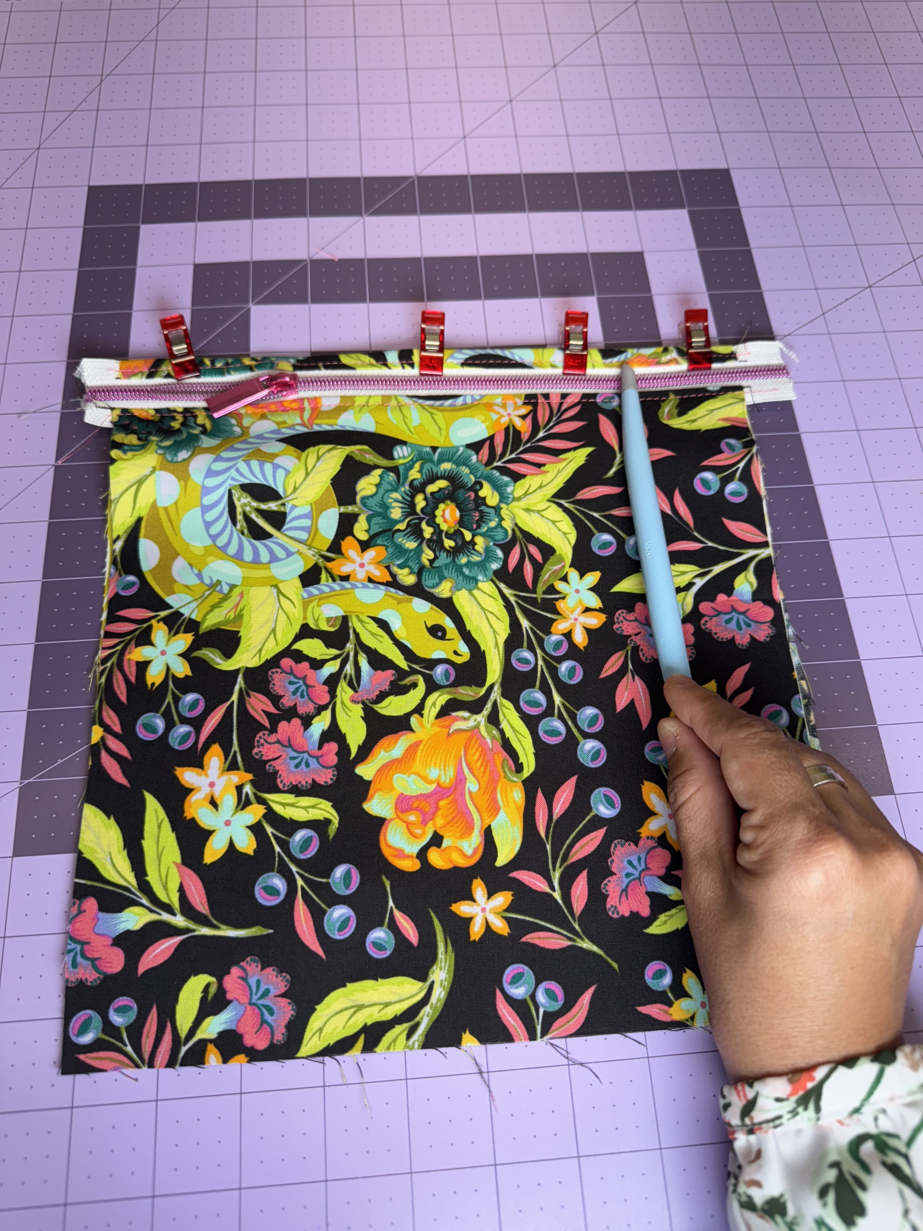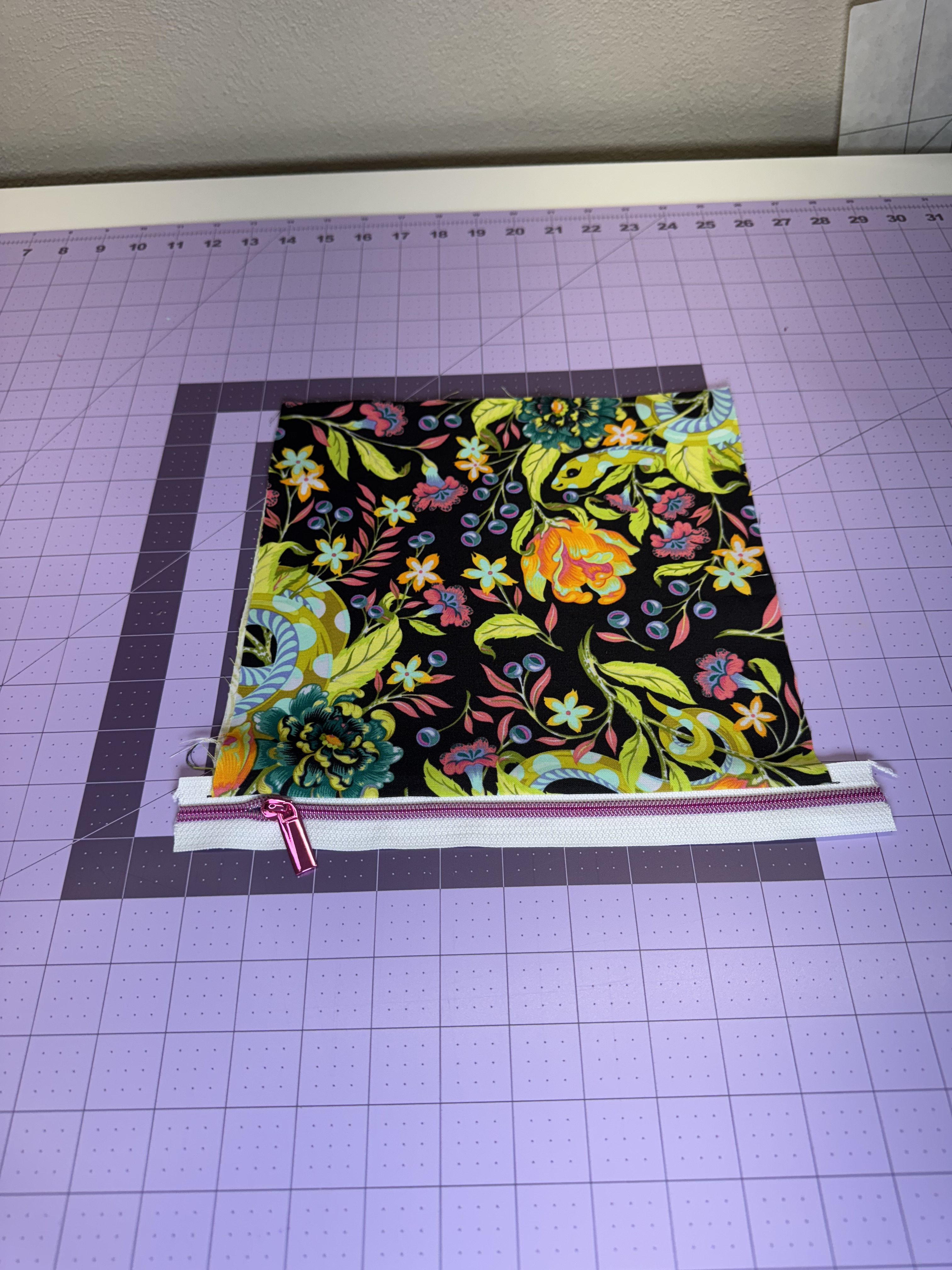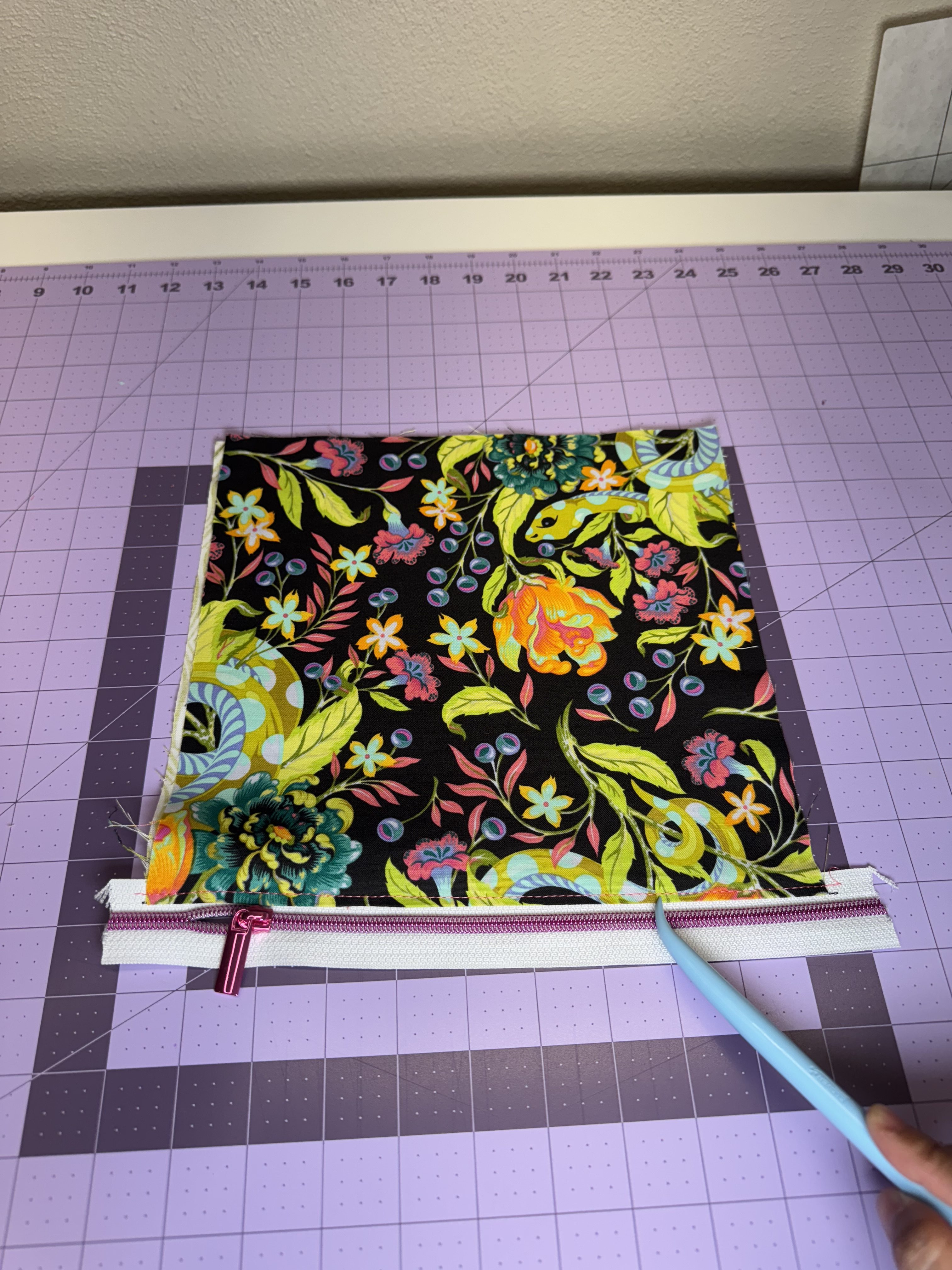 Tomar dos de los cuadrados de 10”. Colocar los cuadrados de tela con los derechos juntos y colocar la parte superior de la cinta de cierre entre ellos. Sujetar con alfileres o hilvanar en su lugar. Coser con un margen de costura de ⅜”.