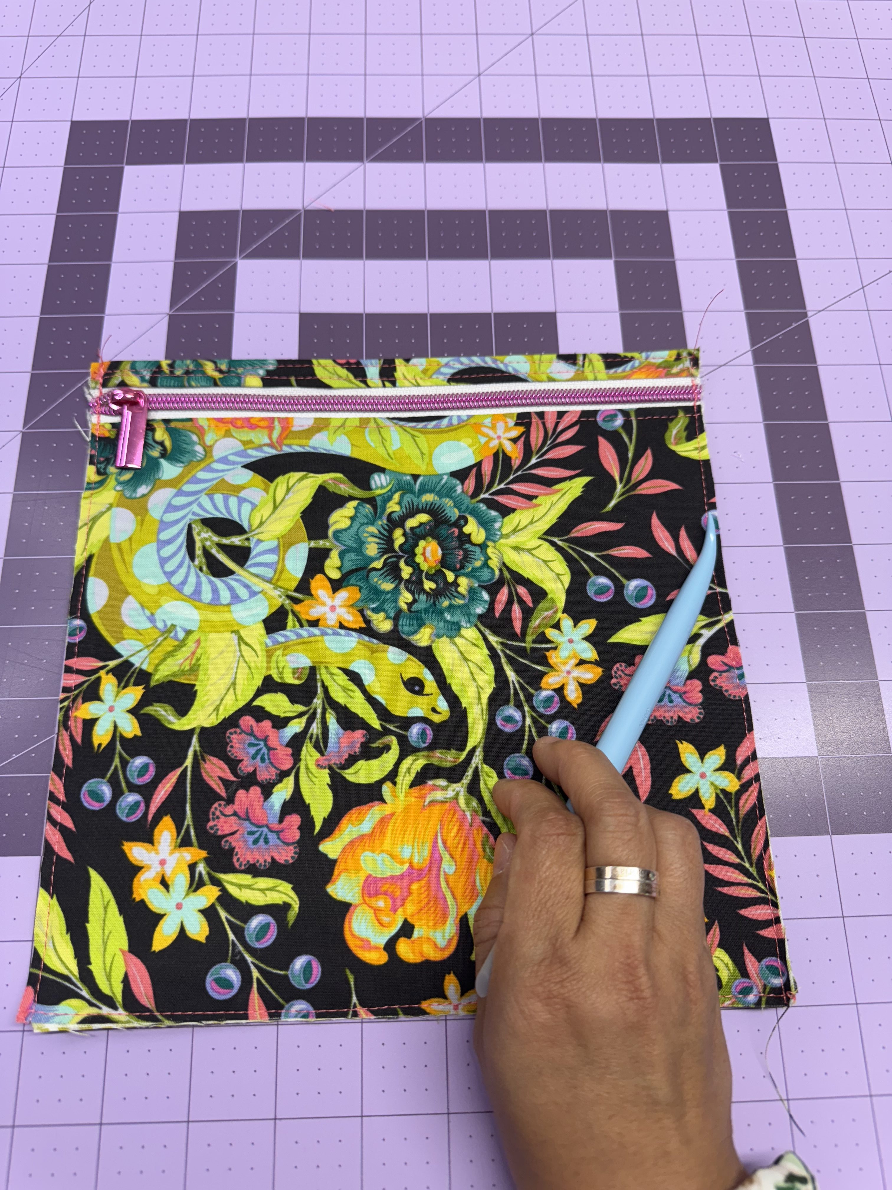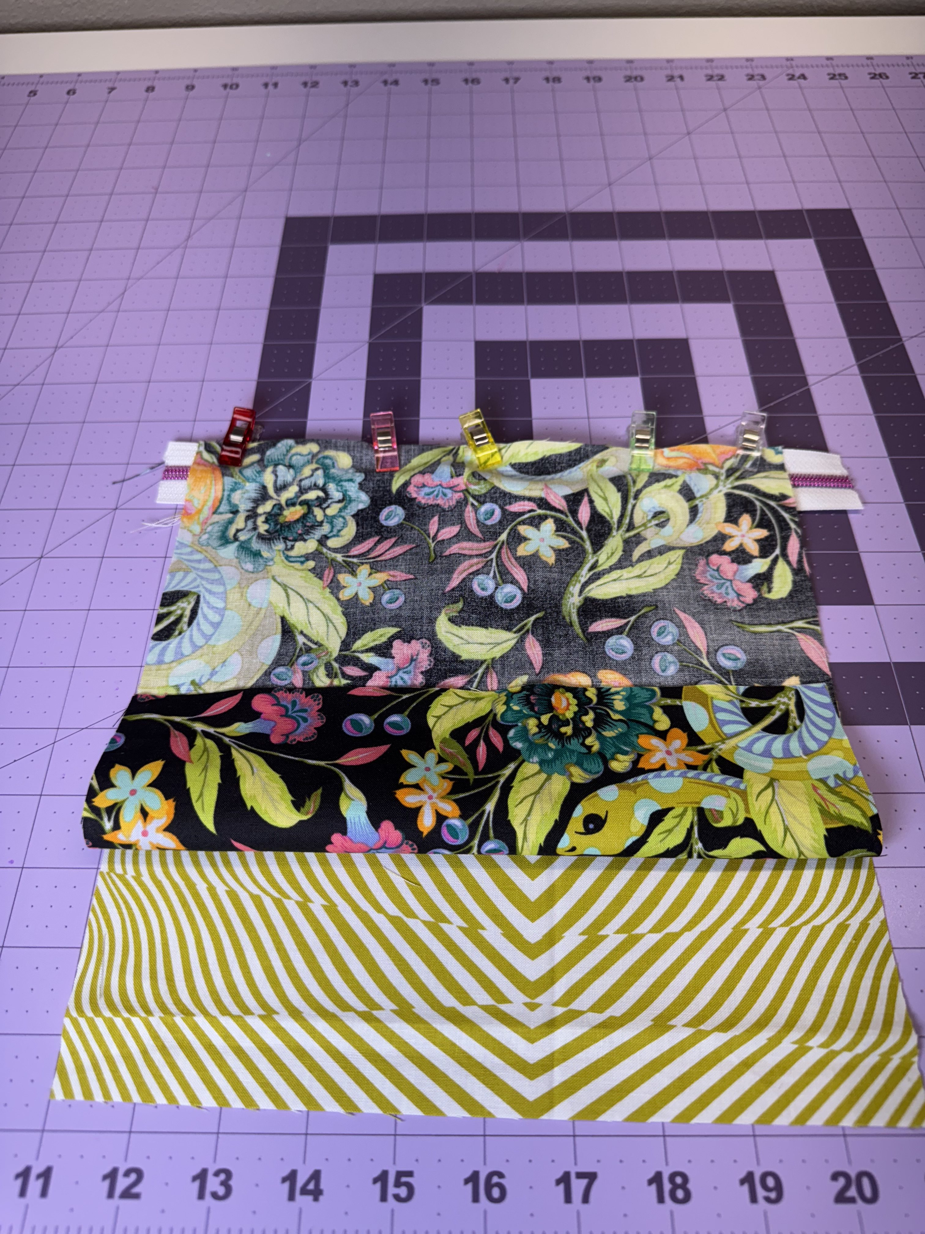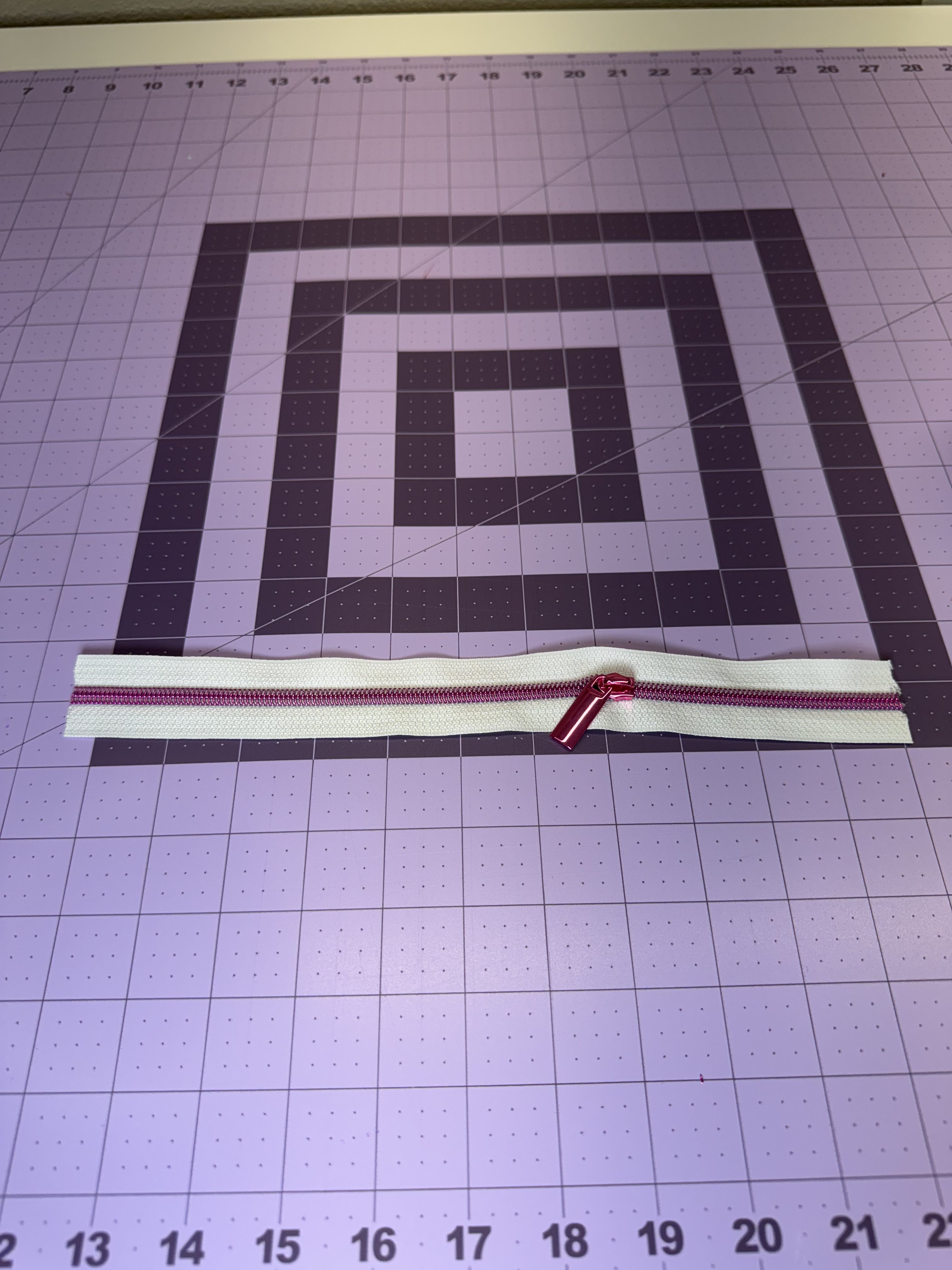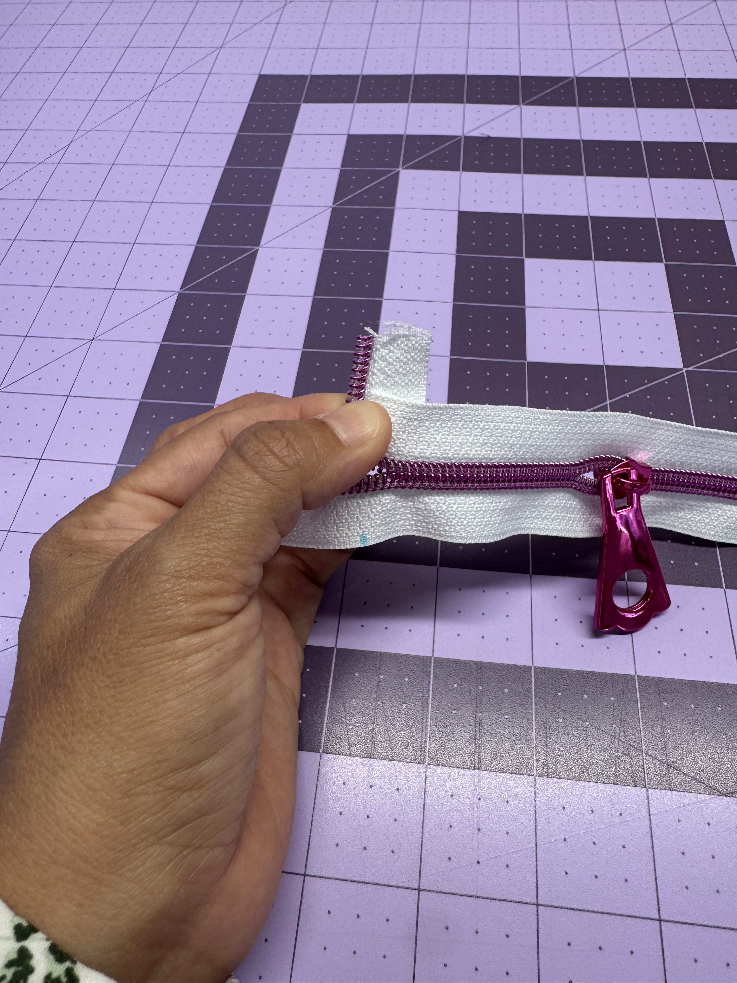 Tomar dos de los cuadrados de 10”. Colocar los cuadrados de tela con los derechos juntos y colocar la parte superior de la cinta de cierre entre ellos. Sujetar con alfileres o hilvanar en su lugar. Coser con un margen de costura de ⅜”.