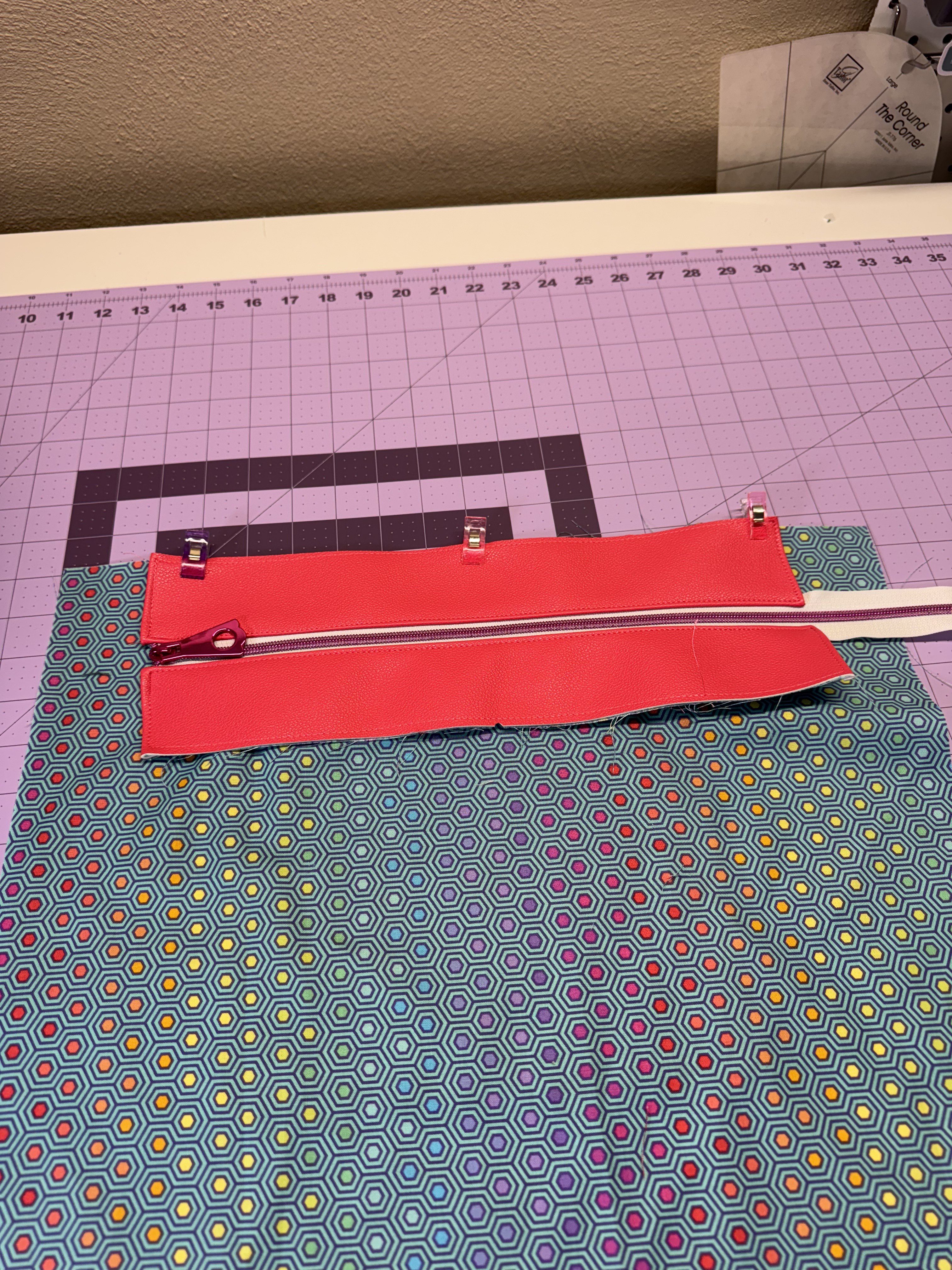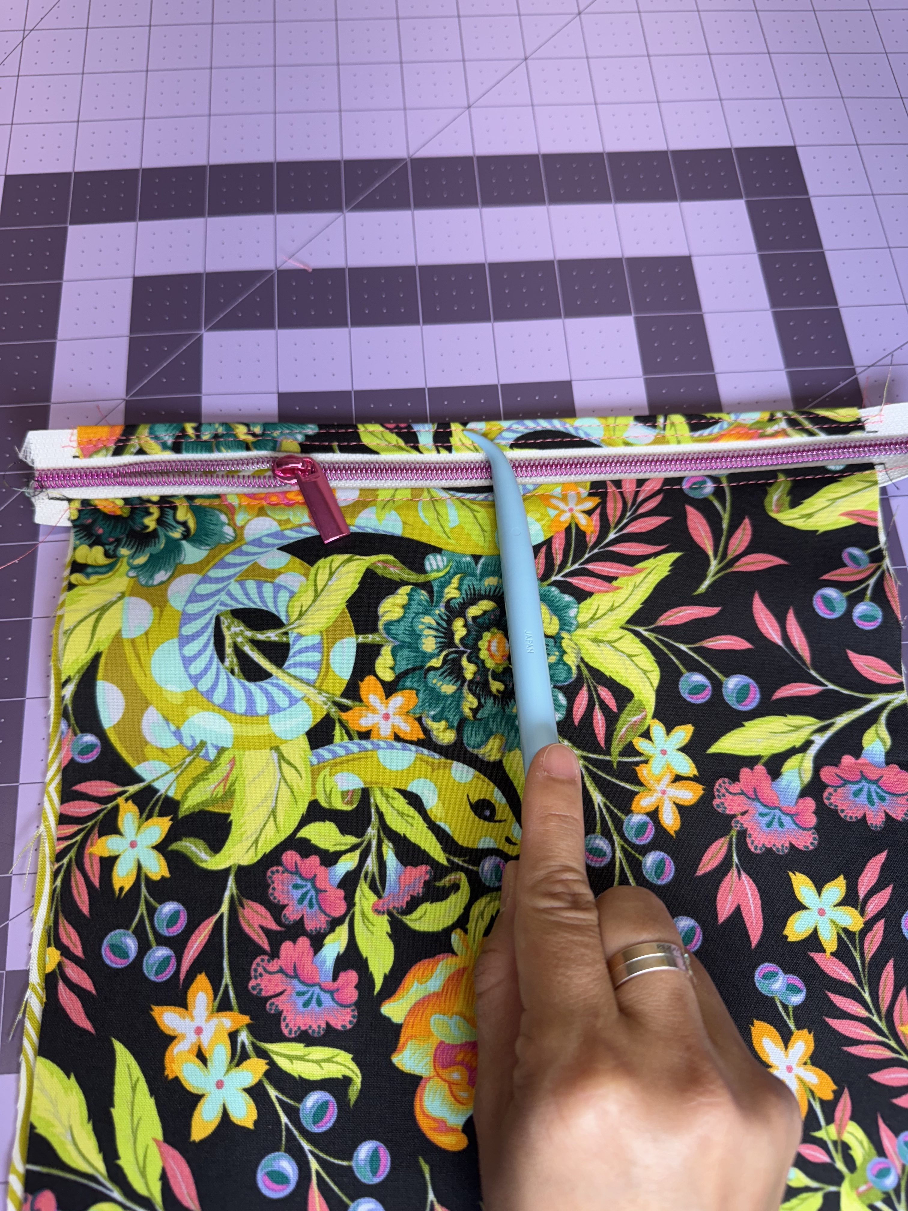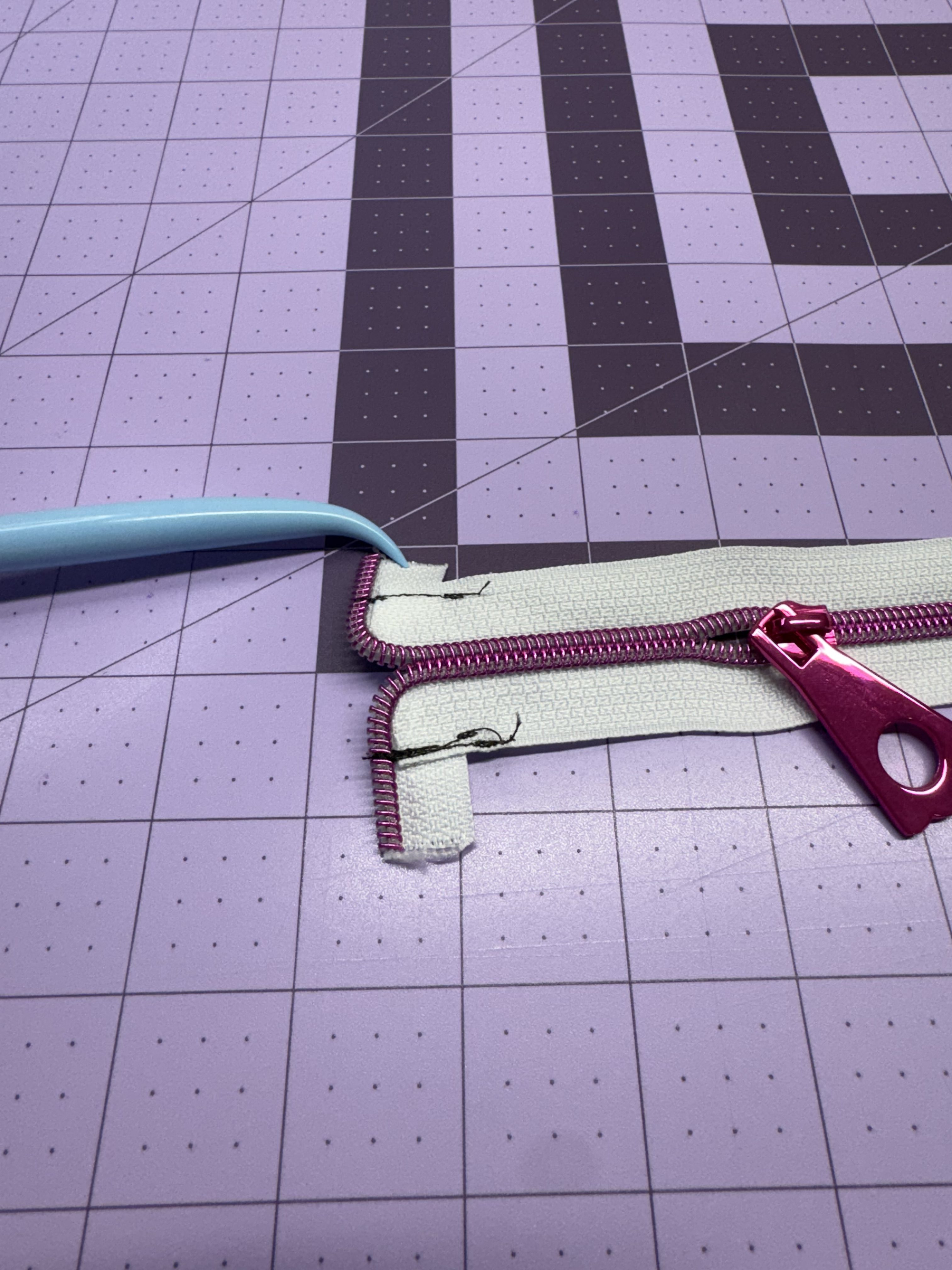 Doblar la tela superior sobre la cinta de cierre superior de manera que cubra aproximadamente ½” del cierre (formando una solapa). Planchar y hacer un pespunte a ⅛” desde el borde doblado.