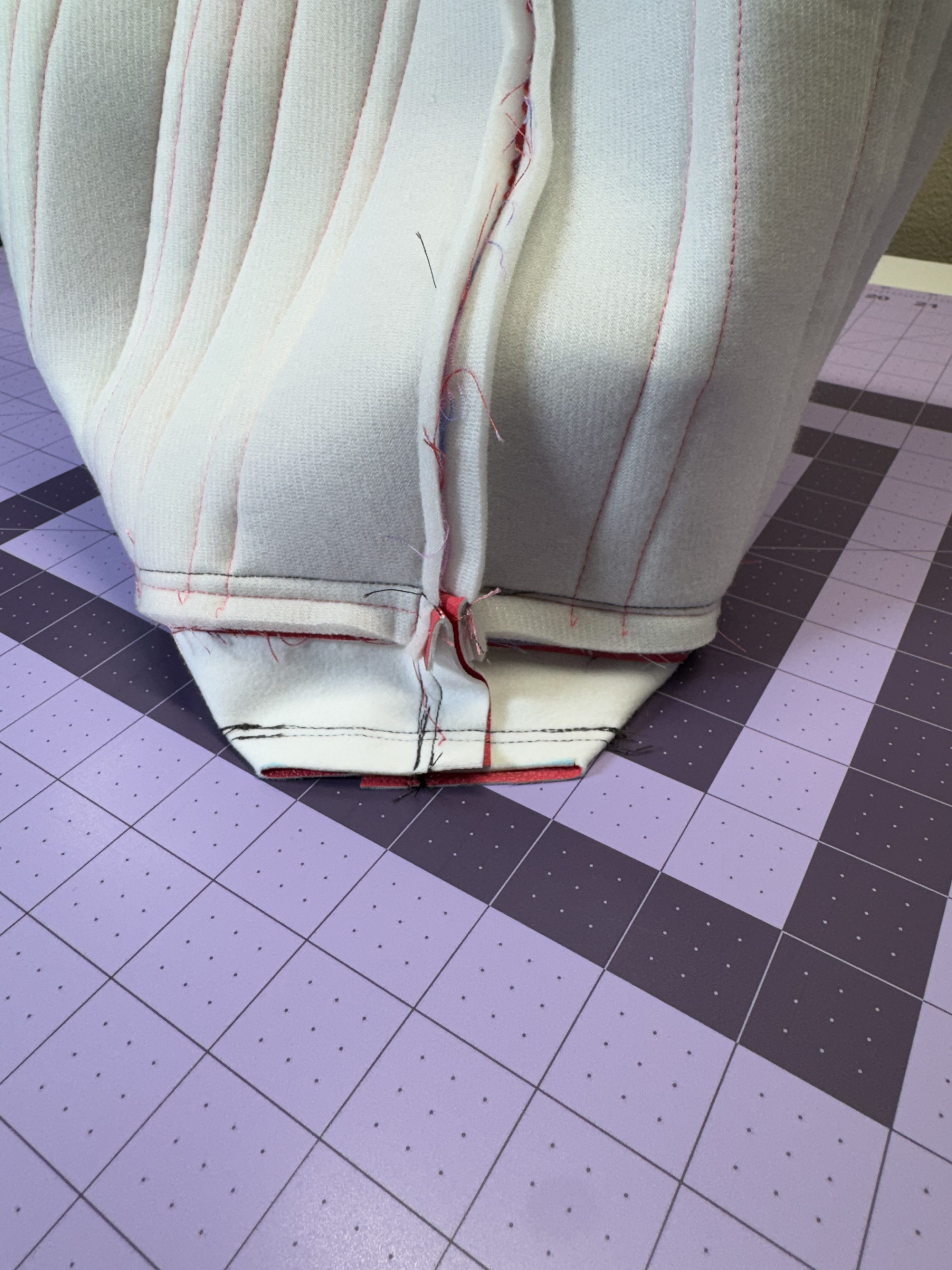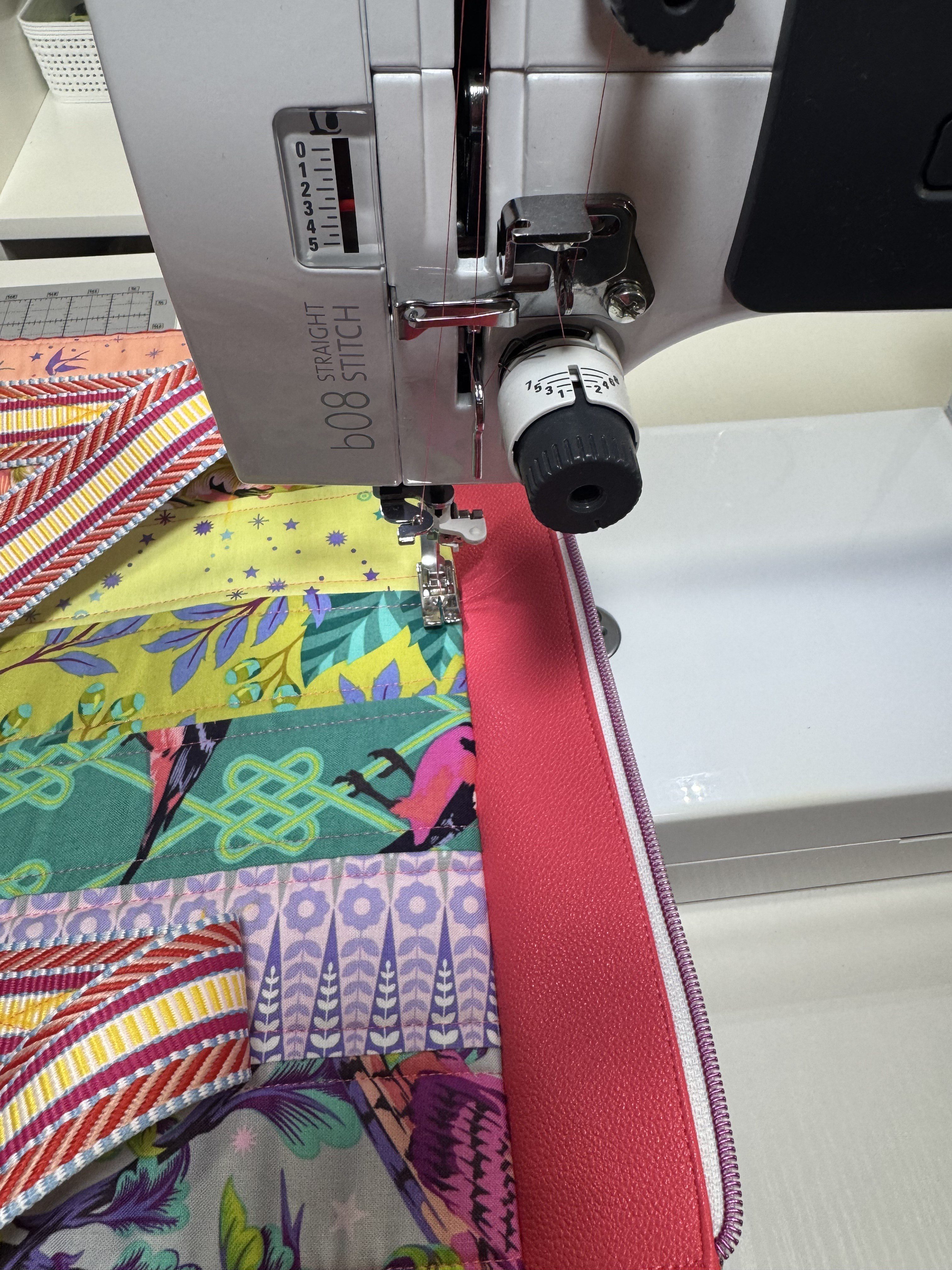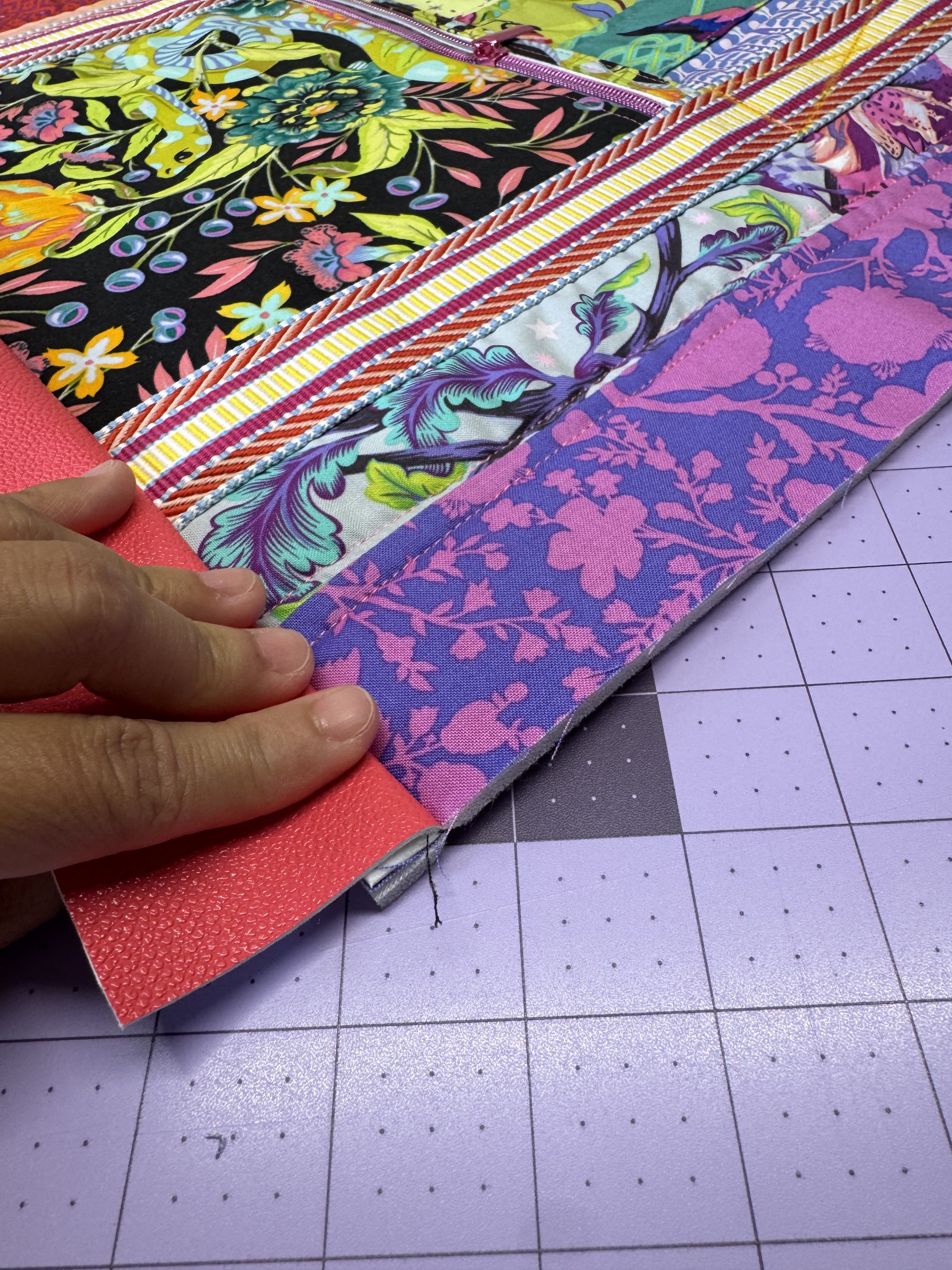 Presionar (no usar plancha debido al vinilo) la costura hacia el lado del vinilo y realizar una costura decorativa a ⅛” de la costura para un acabado profesional.