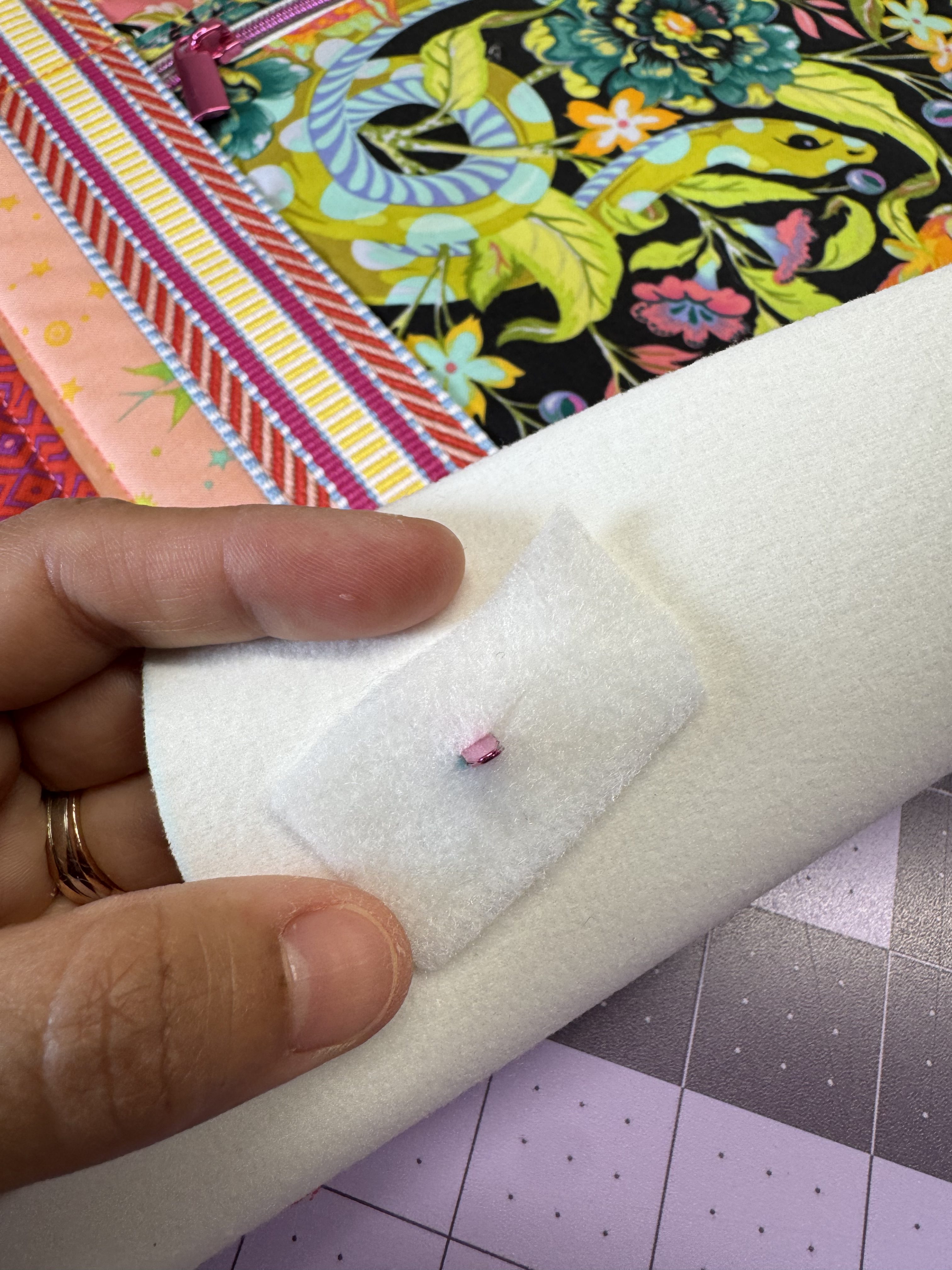 Colocar los extremos de la cinta a lo largo de cada lado del bolsillo con cierre, cubriendo los bordes sin terminar del bolsillo con la cinta para un acabado limpio.