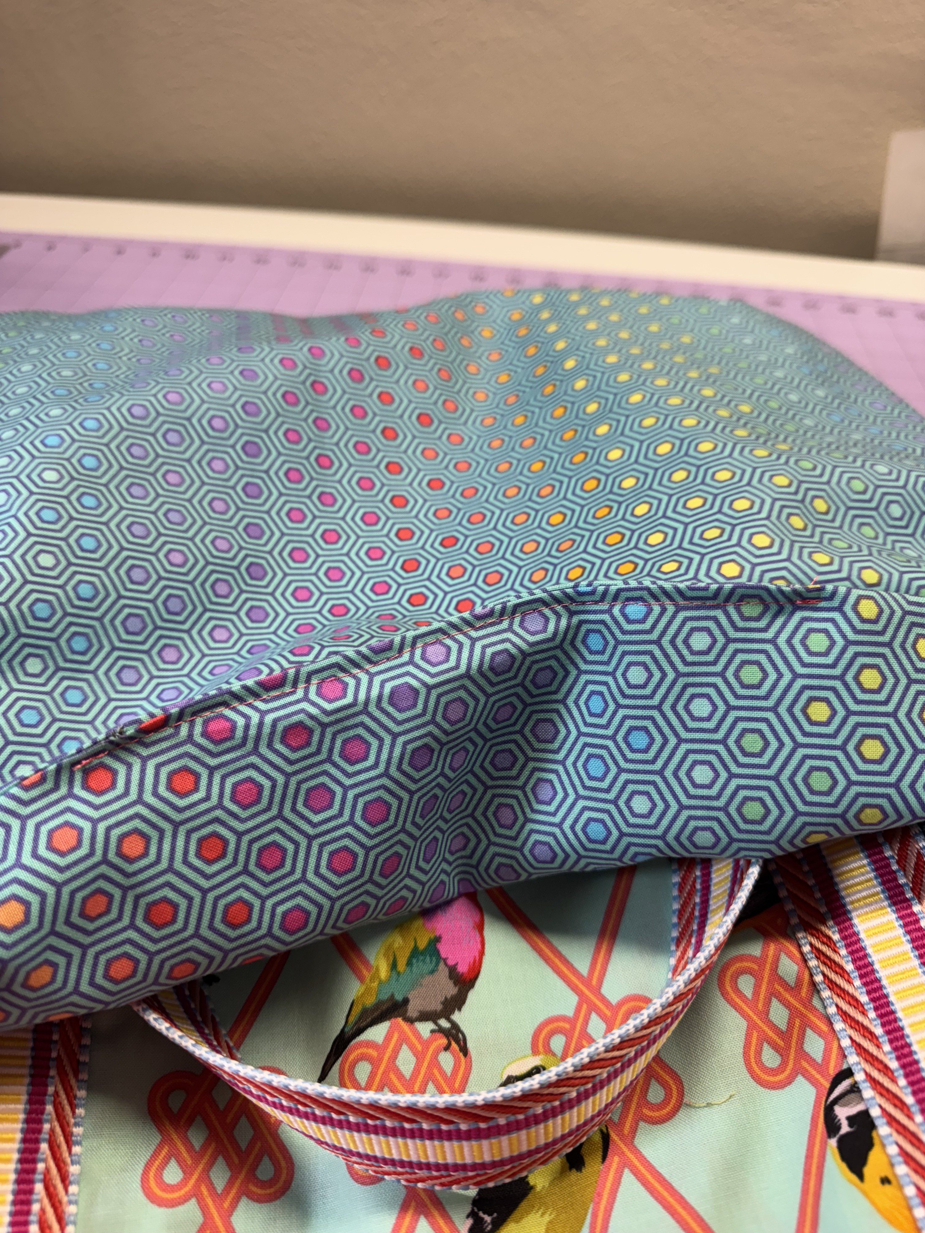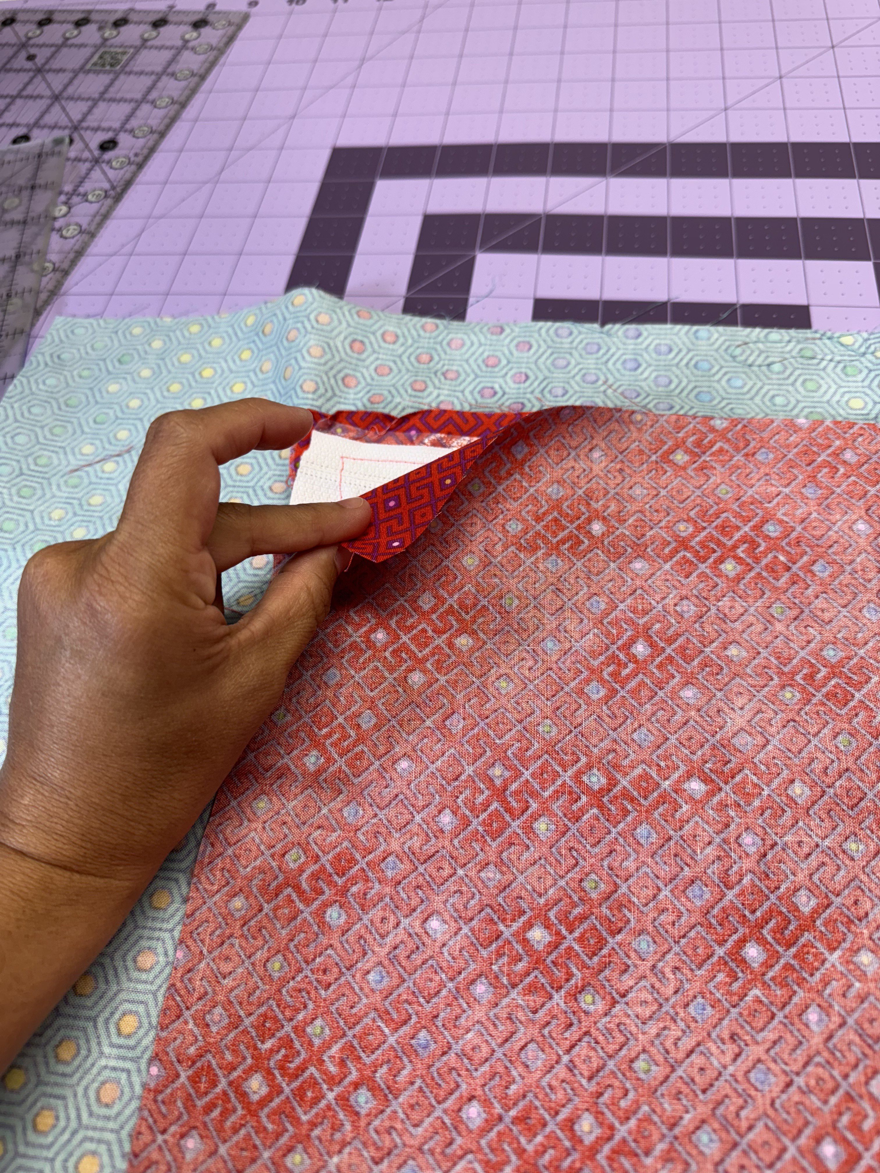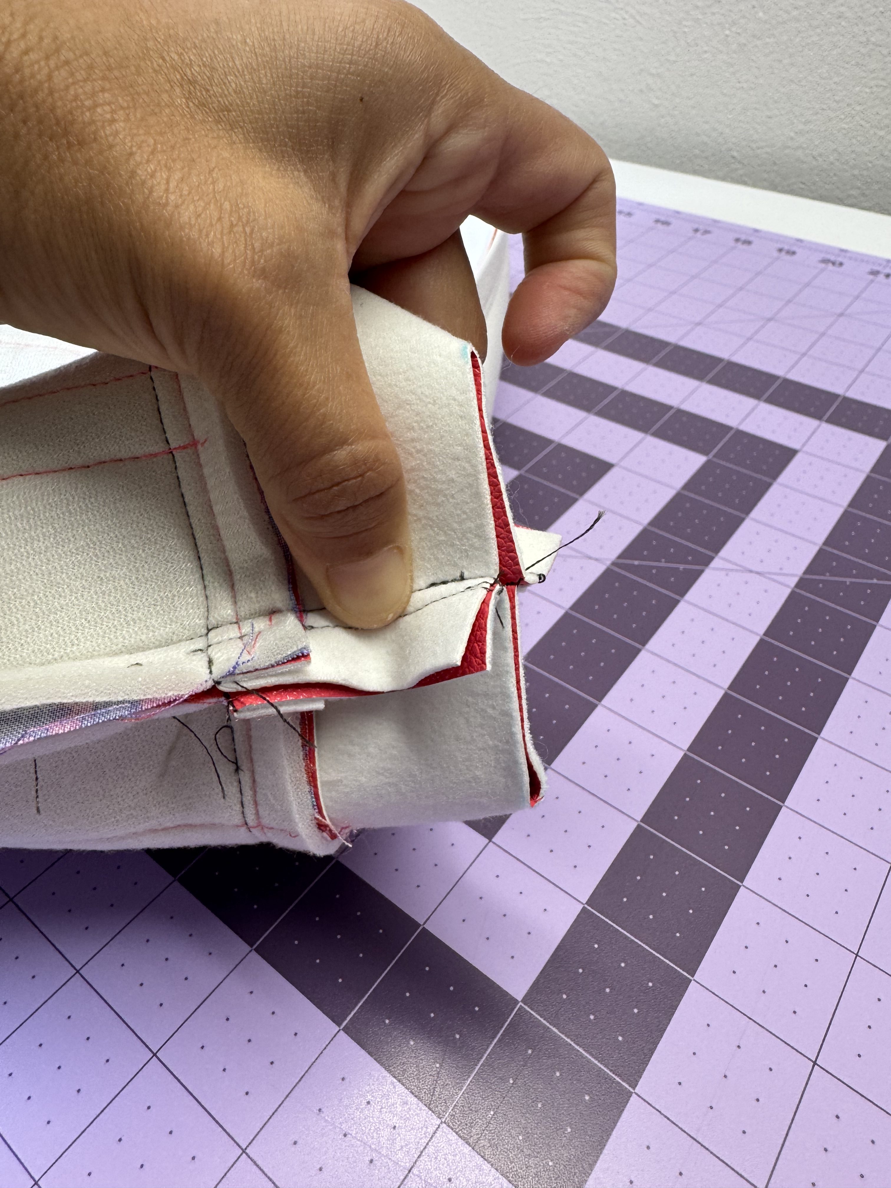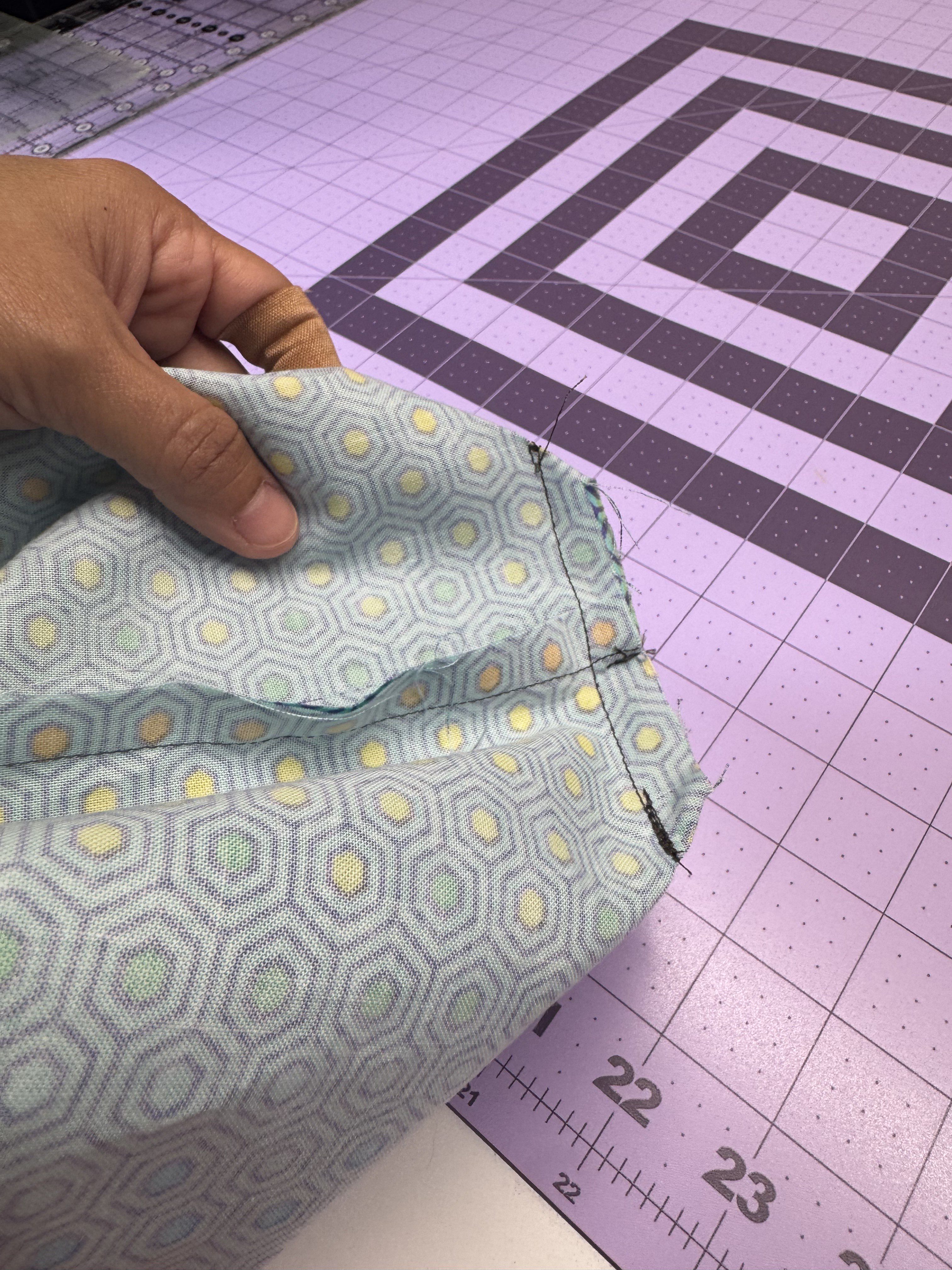 Alinear las costuras laterales e inferior en una de las esquinas para formar una línea recta, creando una forma de caja. Sujetar con pinzas y coser con un margen de costura de ½”.