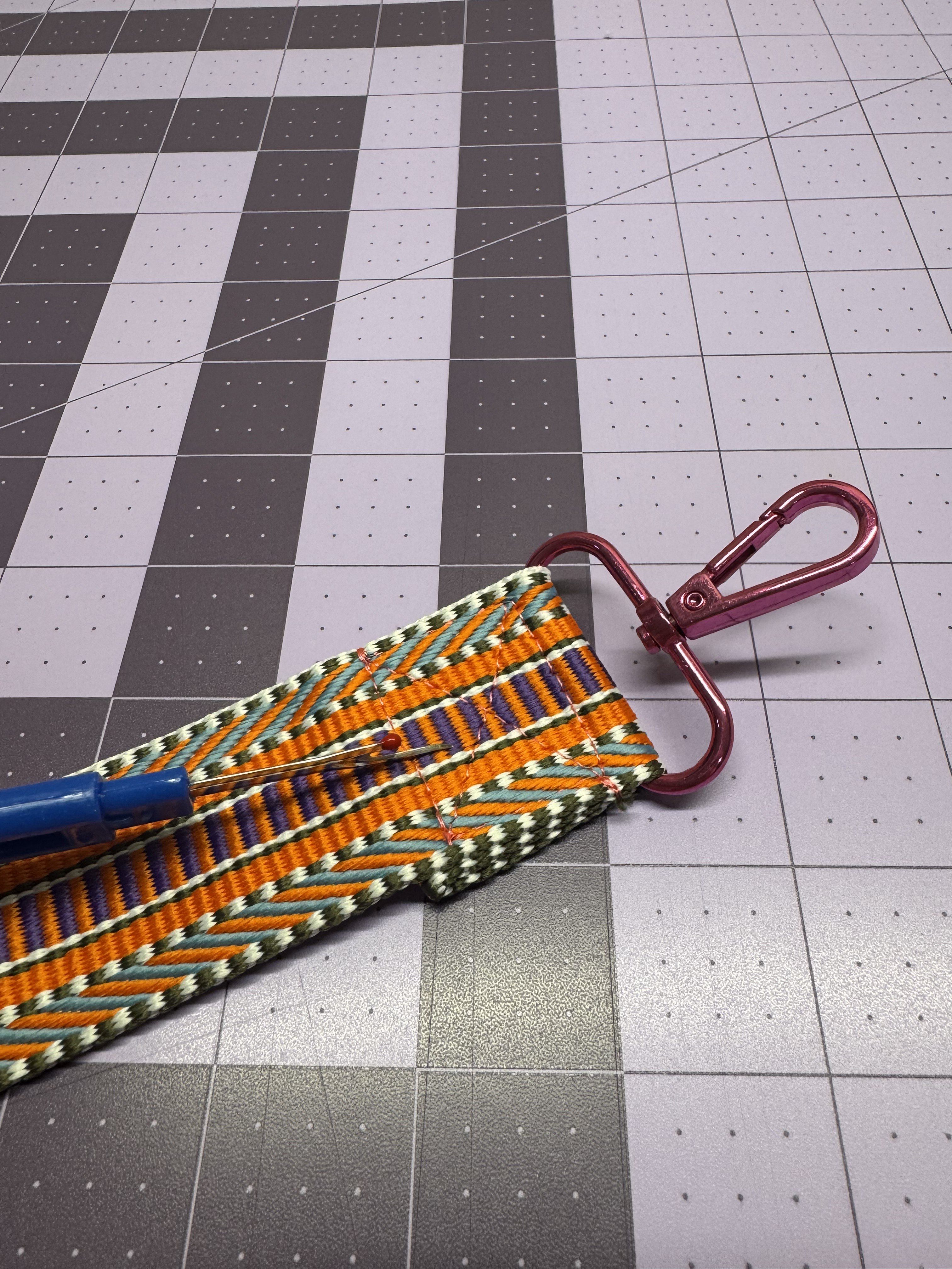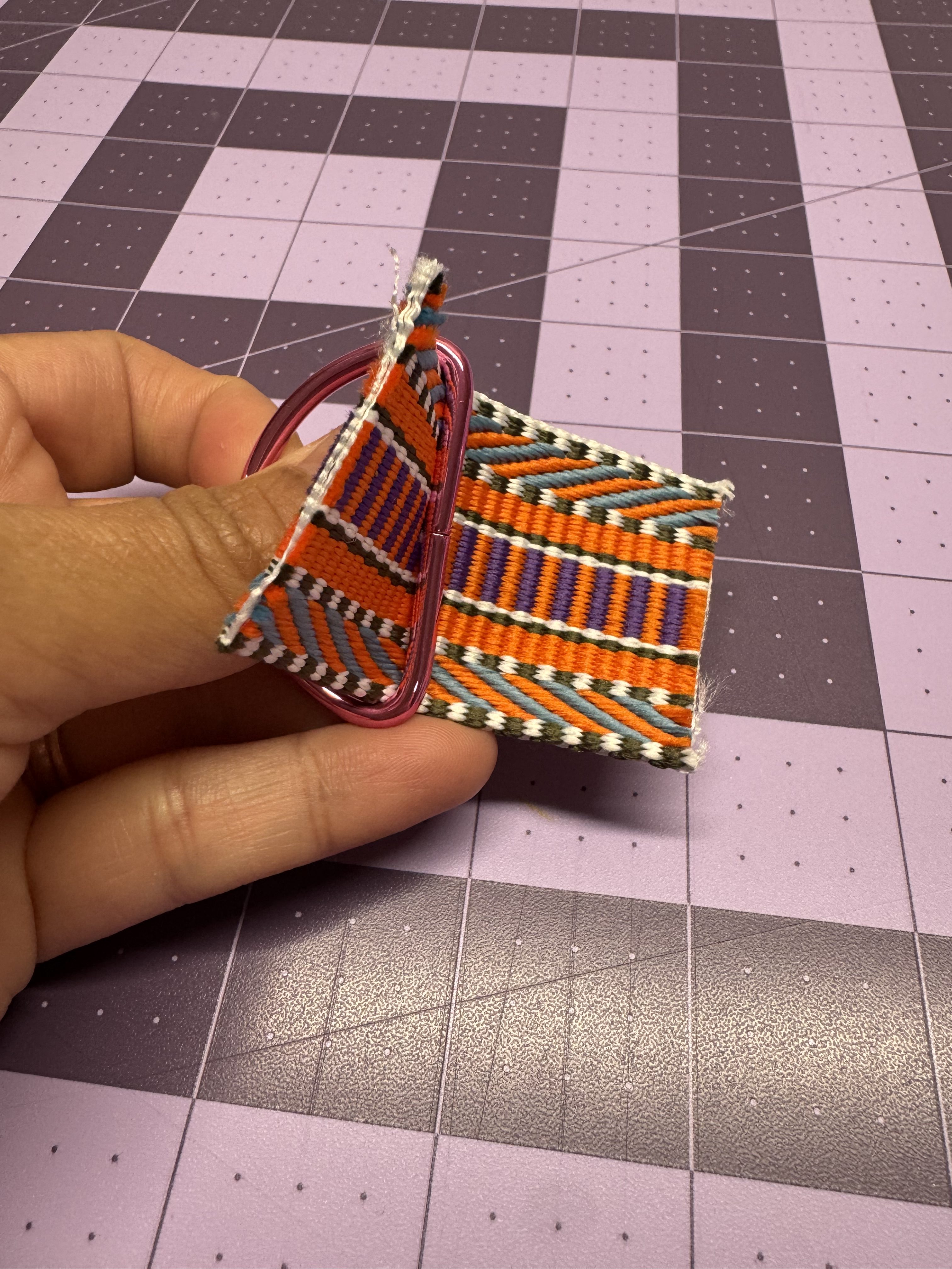 Insertar una tira a través de un anillo tipo D, doblándose por la mitad para que los extremos sin terminar queden alineados. Coser por encima de la cinta lo más cerca posible del anillo tipo D para asegurarla.