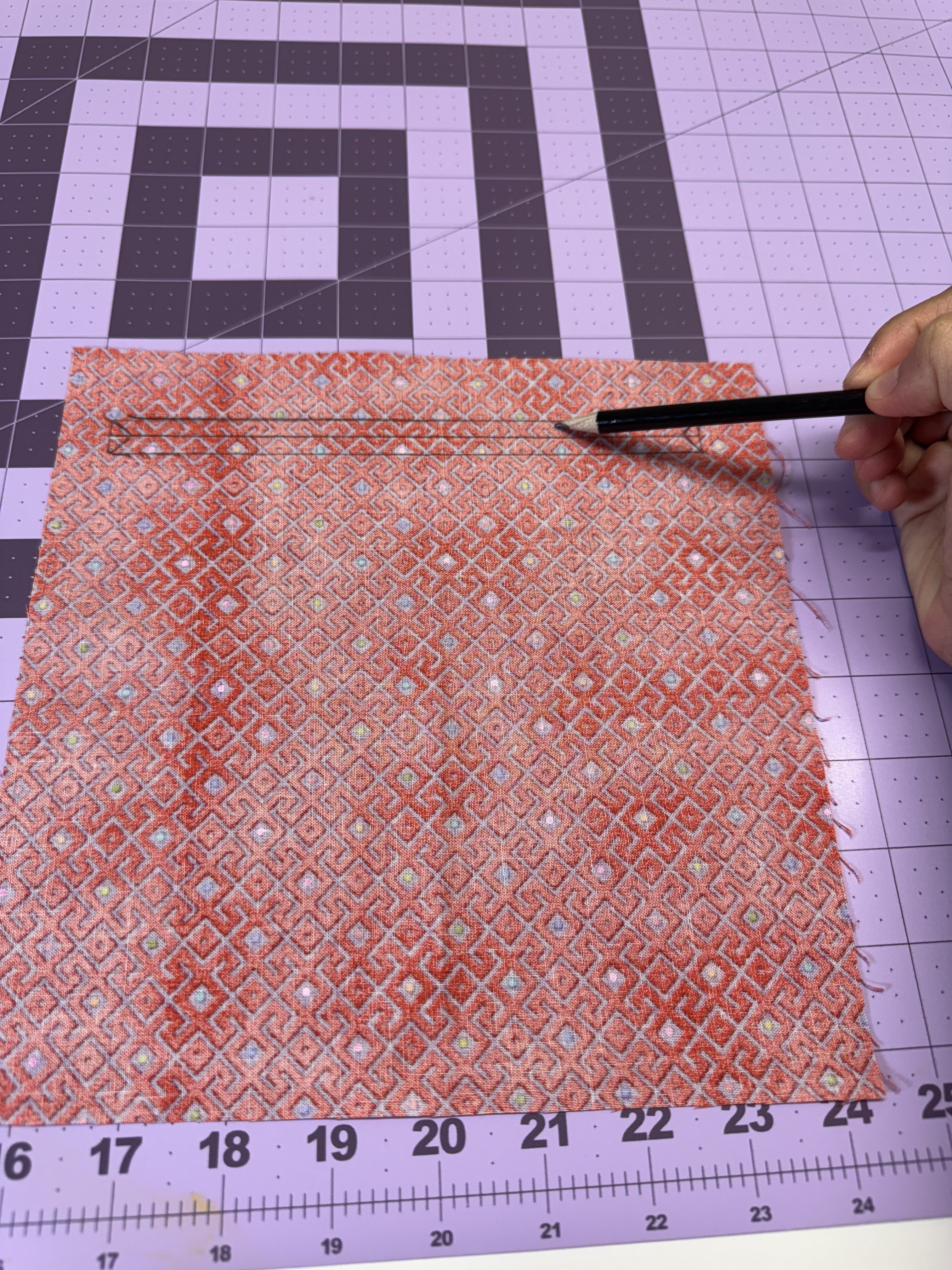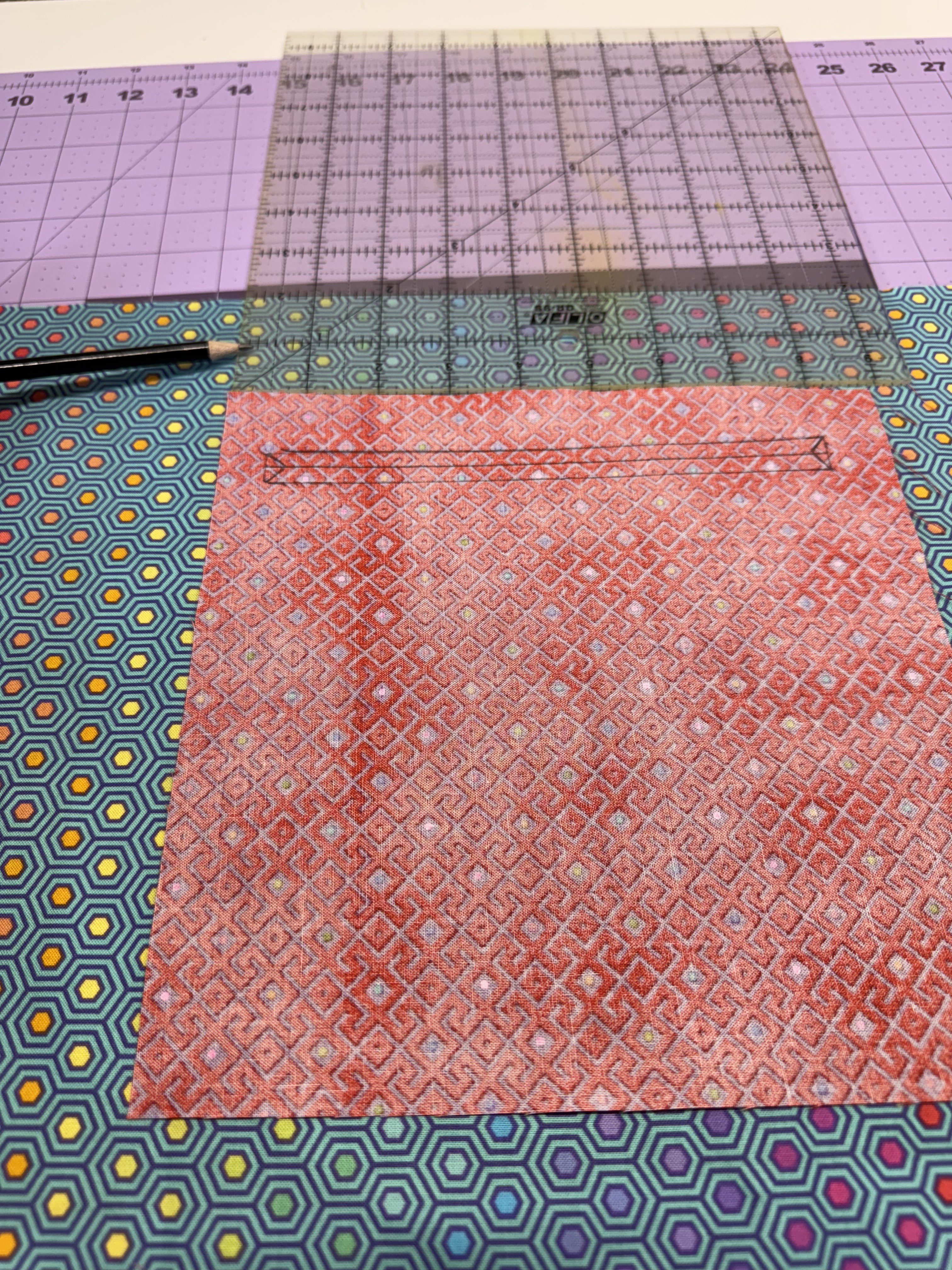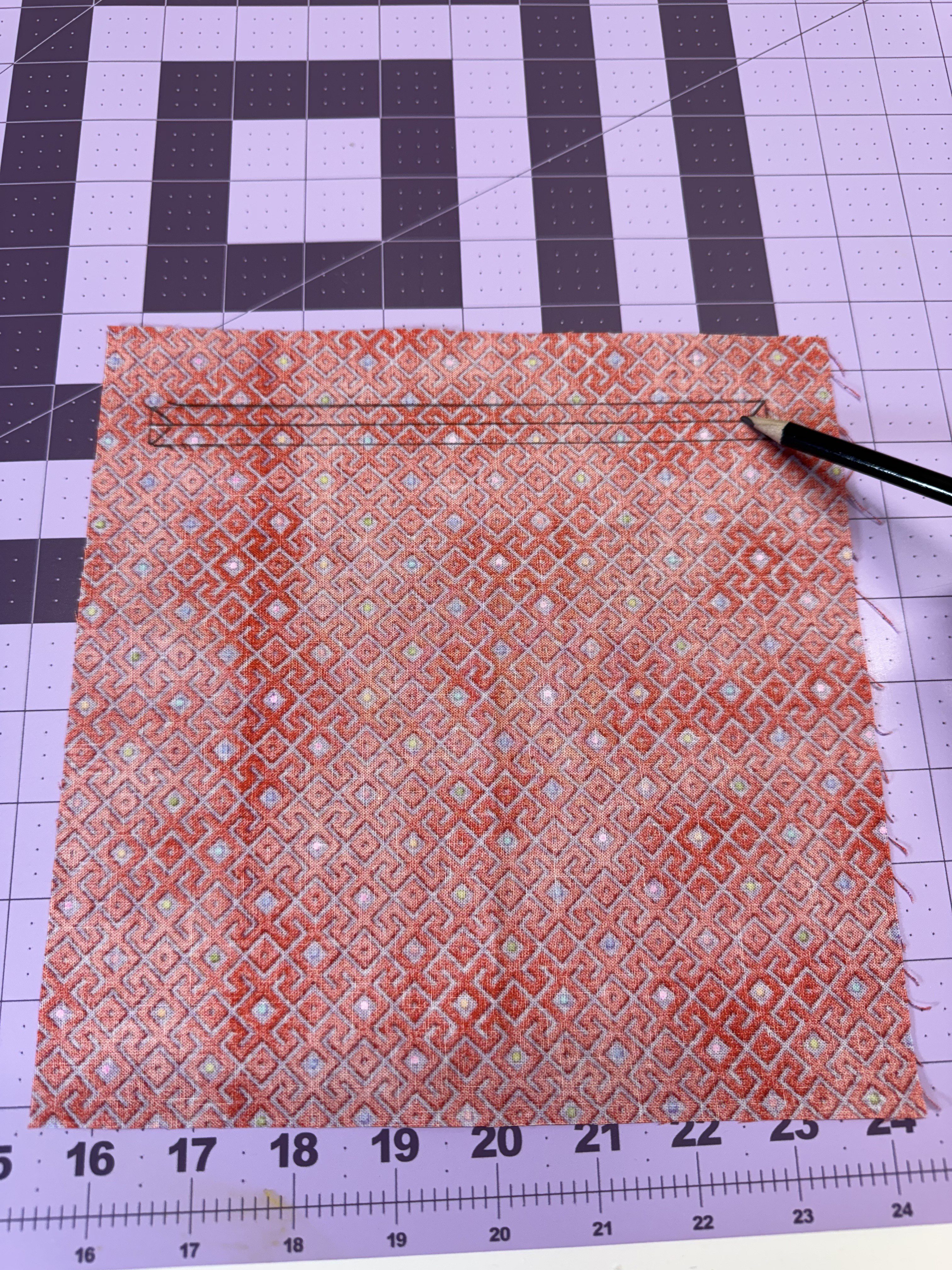 Tomar uno de los cuadrados de 9” y colocarlo con el revés hacia arriba. Medir 1” hacia abajo desde el centro horizontal del cuadrado. Dibujar un rectángulo de 7½” de ancho x ½” de alto.