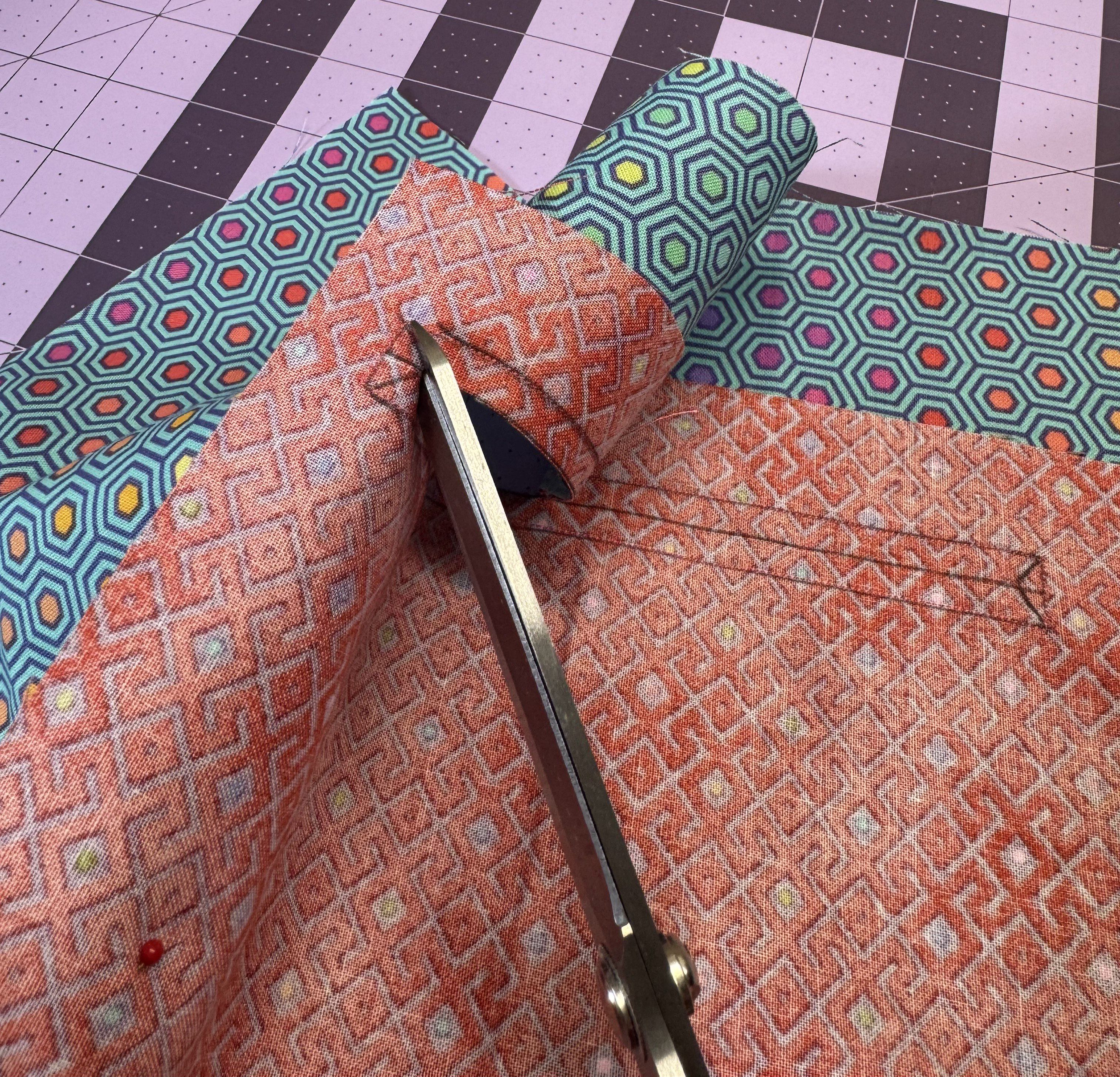 Cortar en diagonal hacia cada esquina, creando pequeños triángulos (sin cortar la costura).