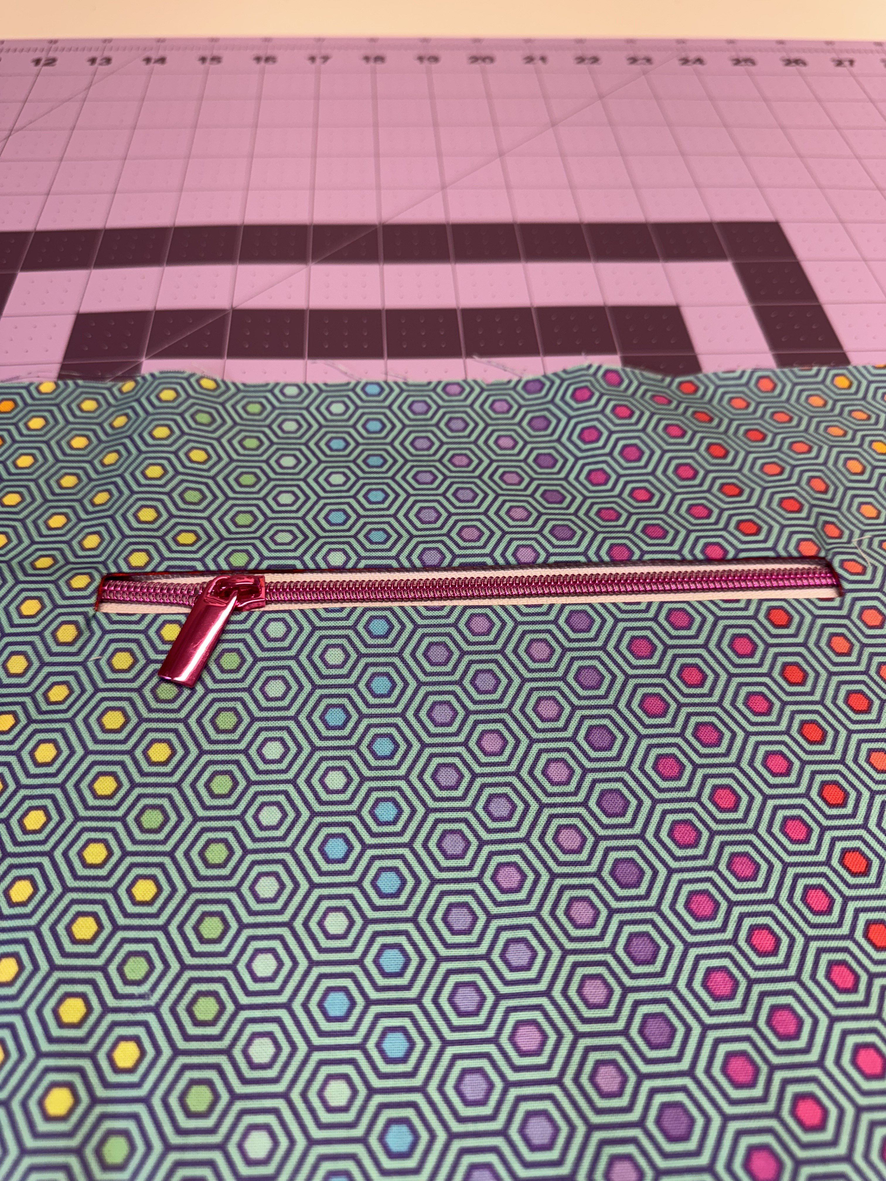 Cortar los bordes inferiores y laterales del bolsillo con el cierre completado a 9” de ancho por 9” de alto, dejando el borde superior con el cierre sin cortar. Hacer un pespunte a lo largo de los dos lados y el borde inferior para asegurar las capas del bolsillo. Reservar el bolsillo para usarlo más adelante.