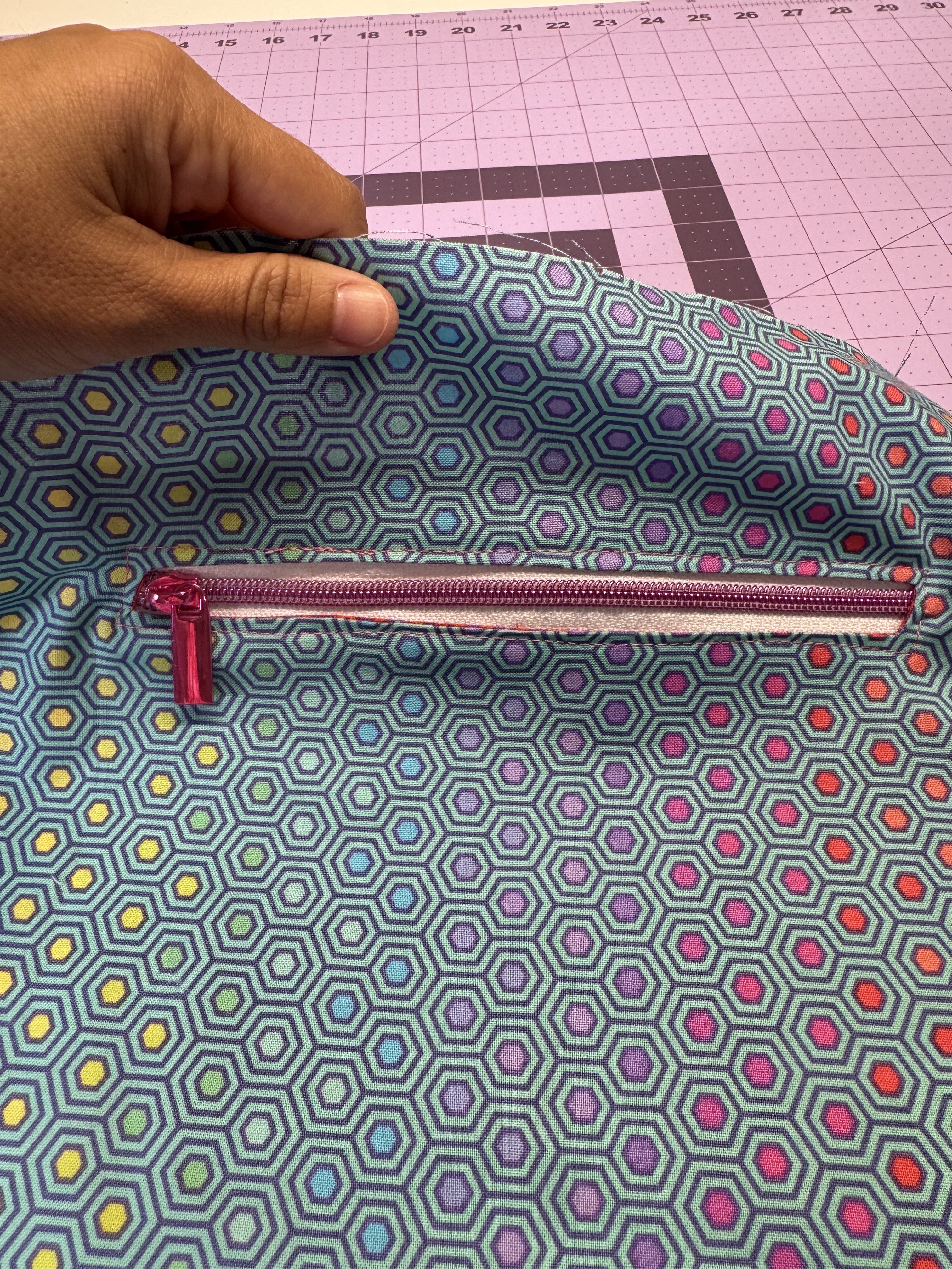 Doblar ambas telas alejándolas del cierre. Sujetar y hacer un pespunte alrededor usando un margen de costura de ⅛”.