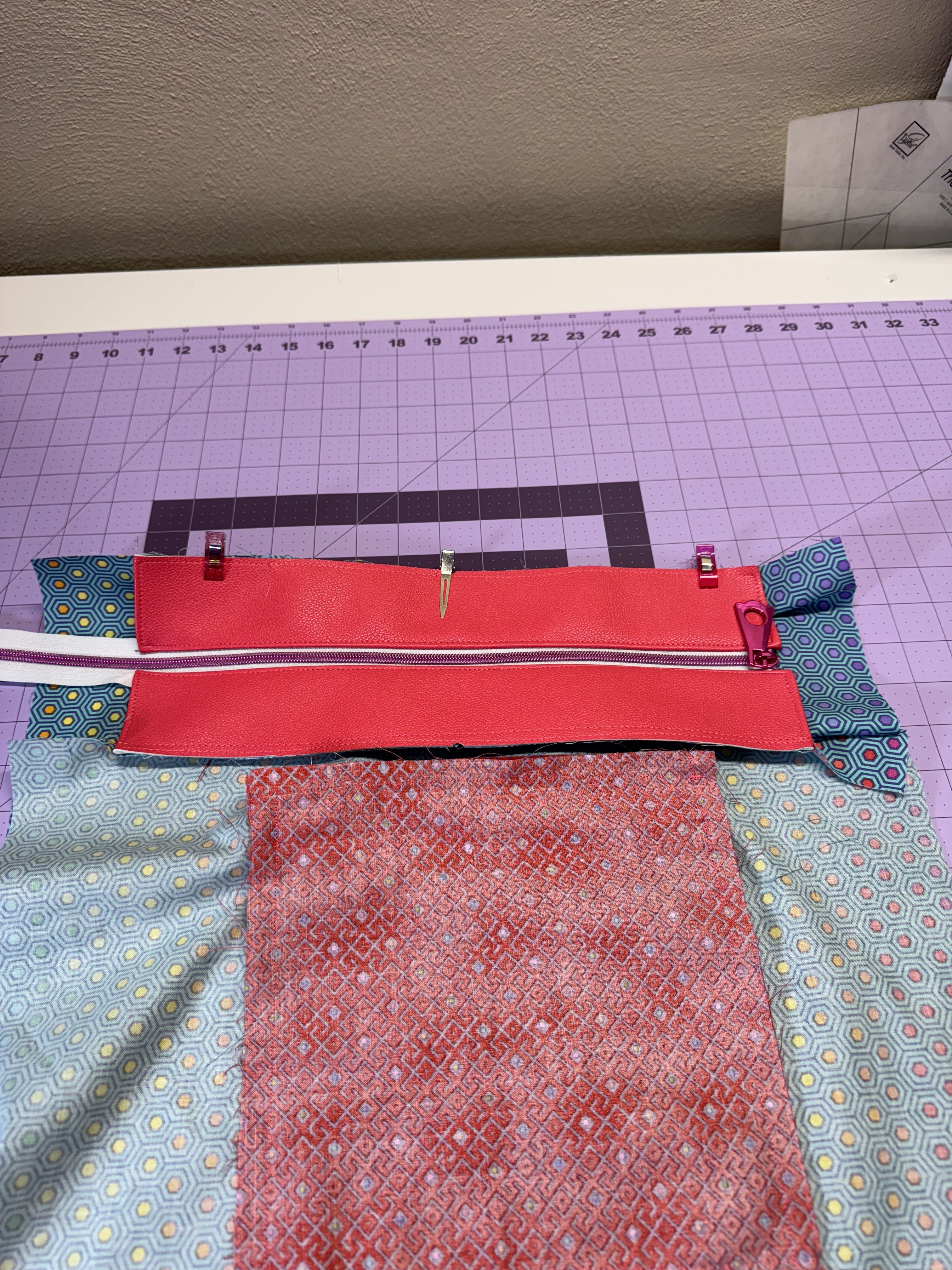 Centrar el bolsillo con cierre en la parte inferior del panel, alineando los bordes inferiores, y sujetar con pinzas.