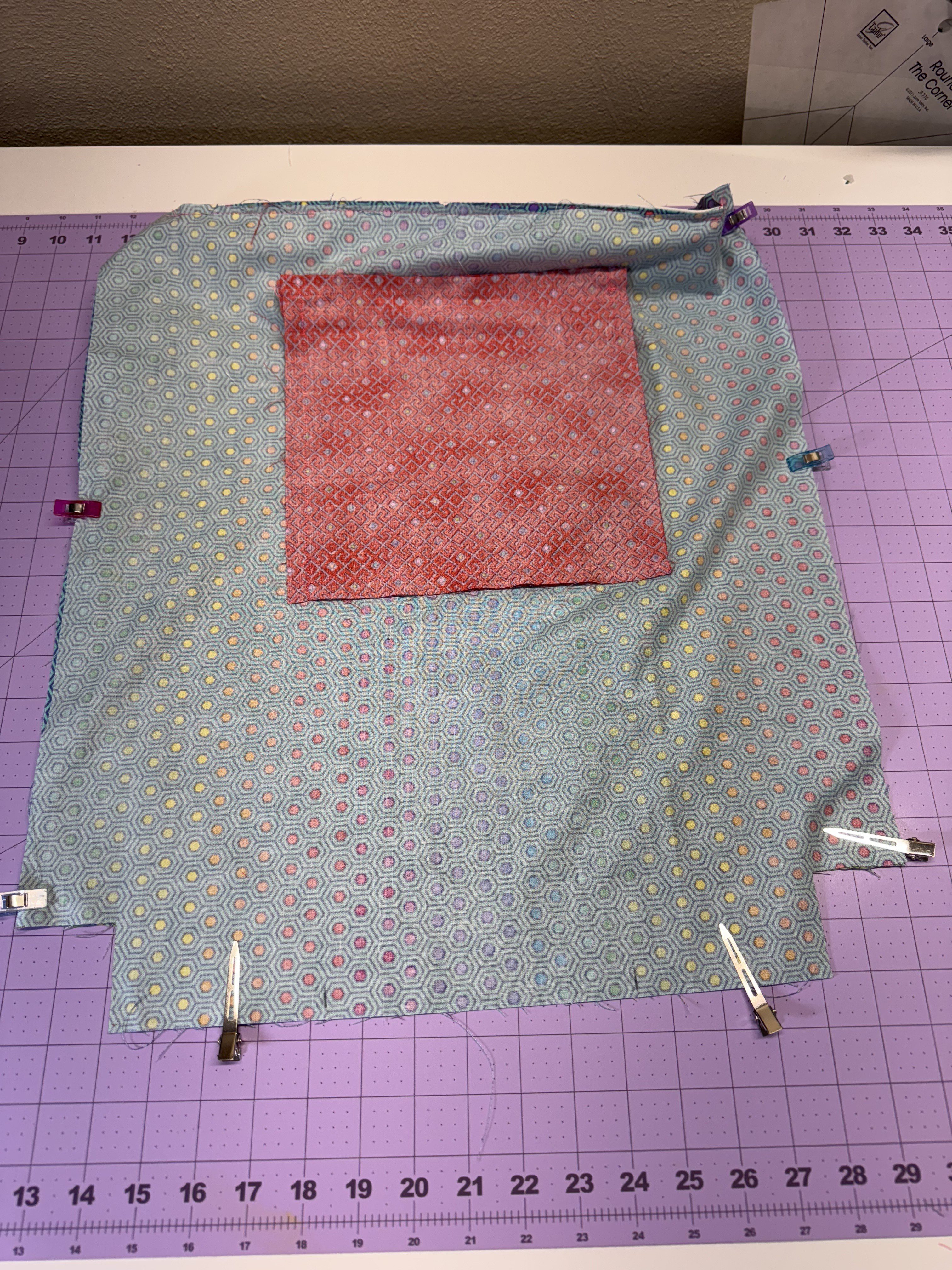 Colocar el segundo cuadrado de 9” con los derechos enfrentados al primer cuadrado del bolsillo (en la parte posterior del panel). Sujetar alrededor de los bordes del bolsillo, asegurándose de no atrapar el panel del forro.