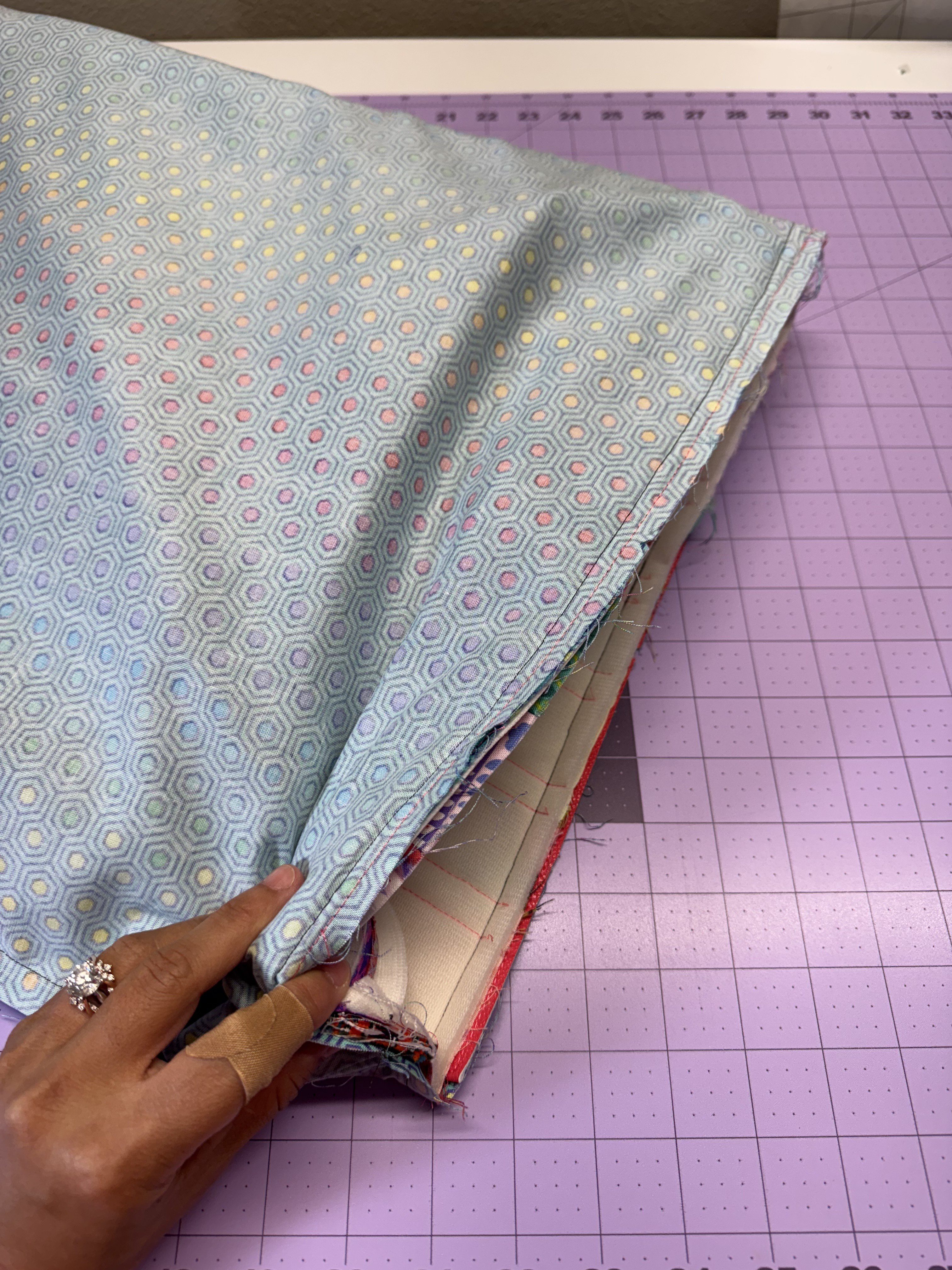 Colocar los paneles exteriores delantero y posterior con los derechos enfrentados. Coser los bordes laterales e inferiores usando un margen de costura de ½”.