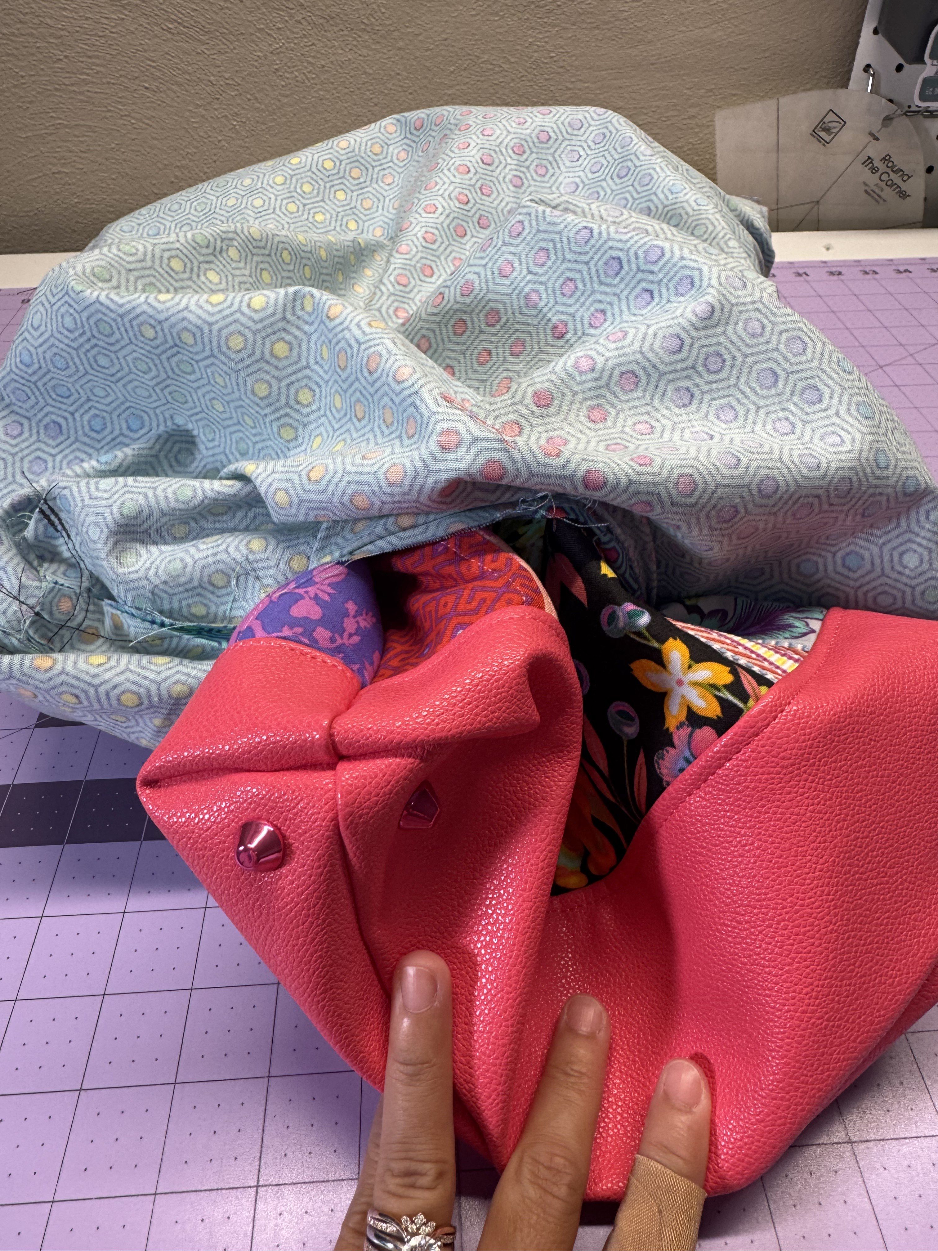 Con el exterior del bolso, insertarlo dentro del forro (que está del revés): los derechos deben estar juntos.