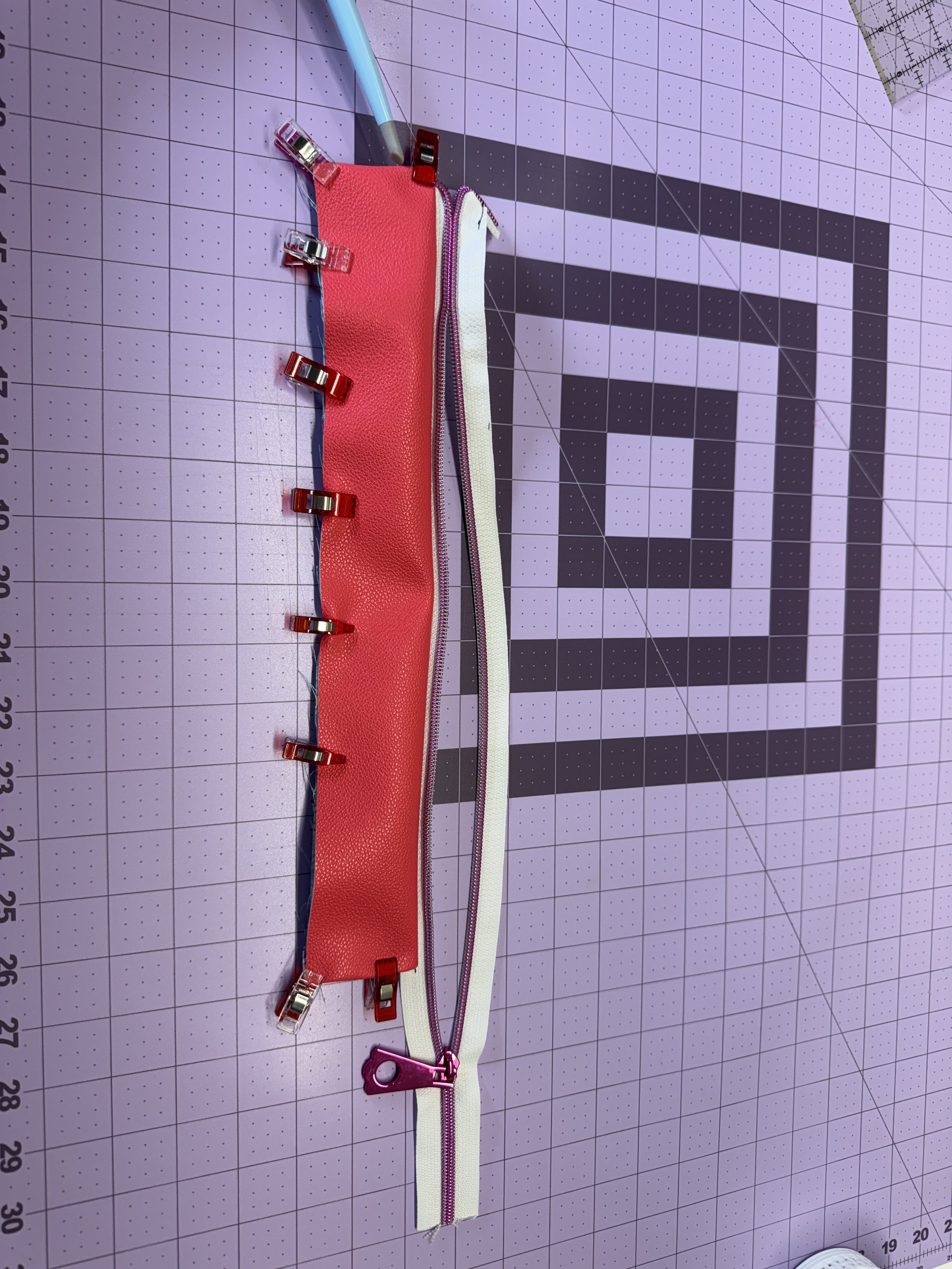 Centrar el bolsillo con cierre en la parte inferior del panel, alineando los bordes inferiores, y sujetar con pinzas.