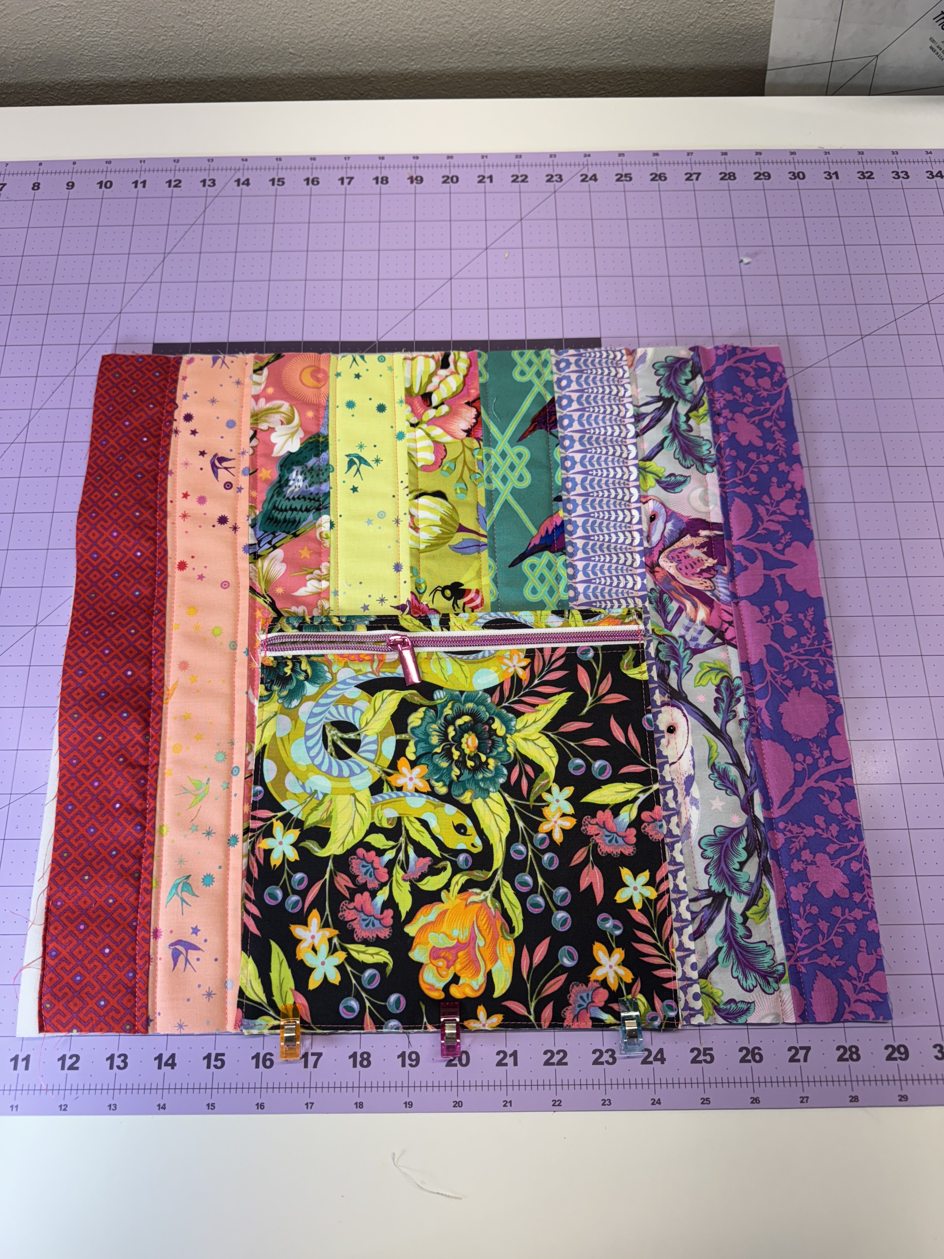 - (Si usas tiras de tela, añade 2 FQs adicionales para los bolsillos exteriores delanteros y traseros.)