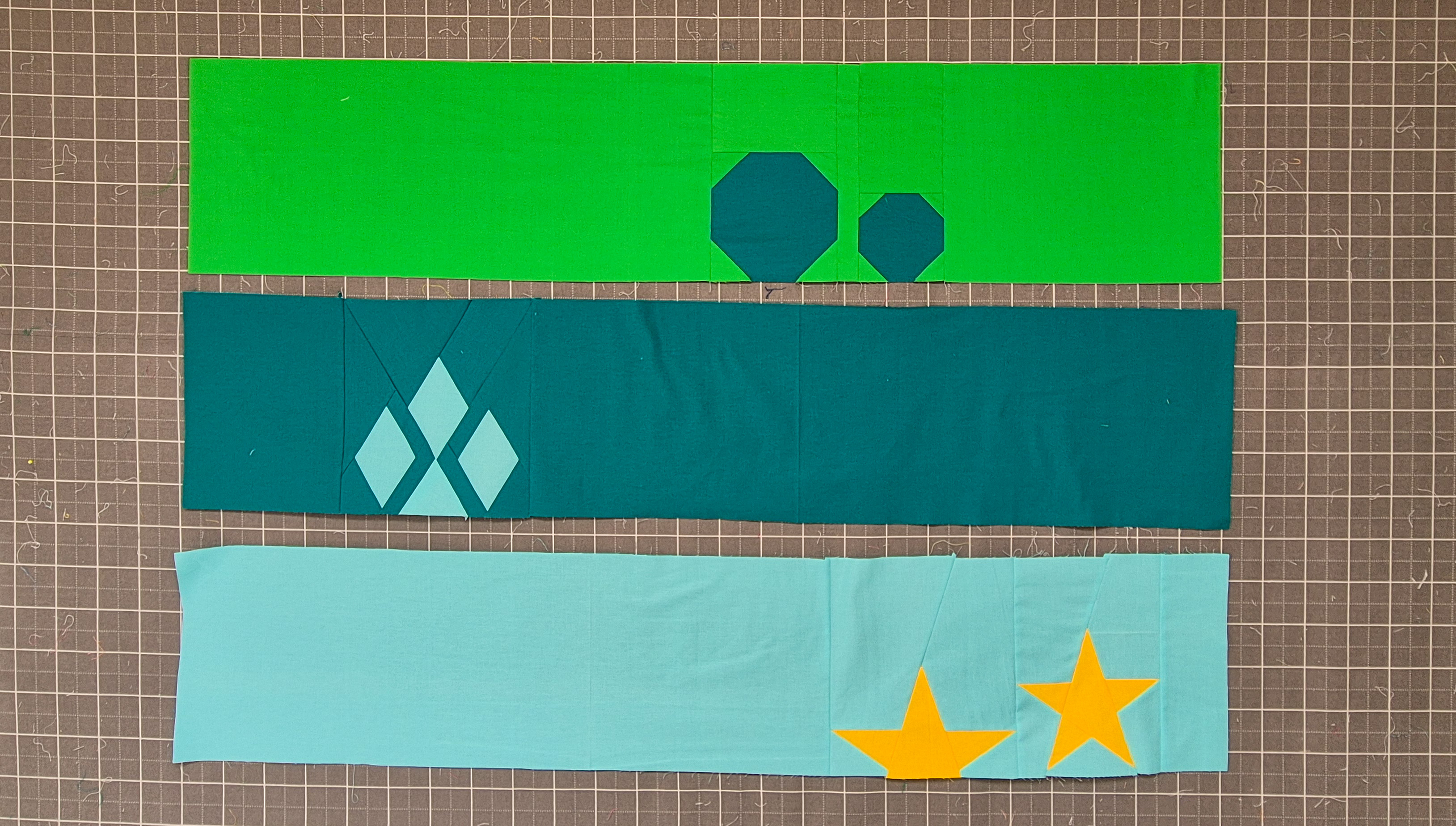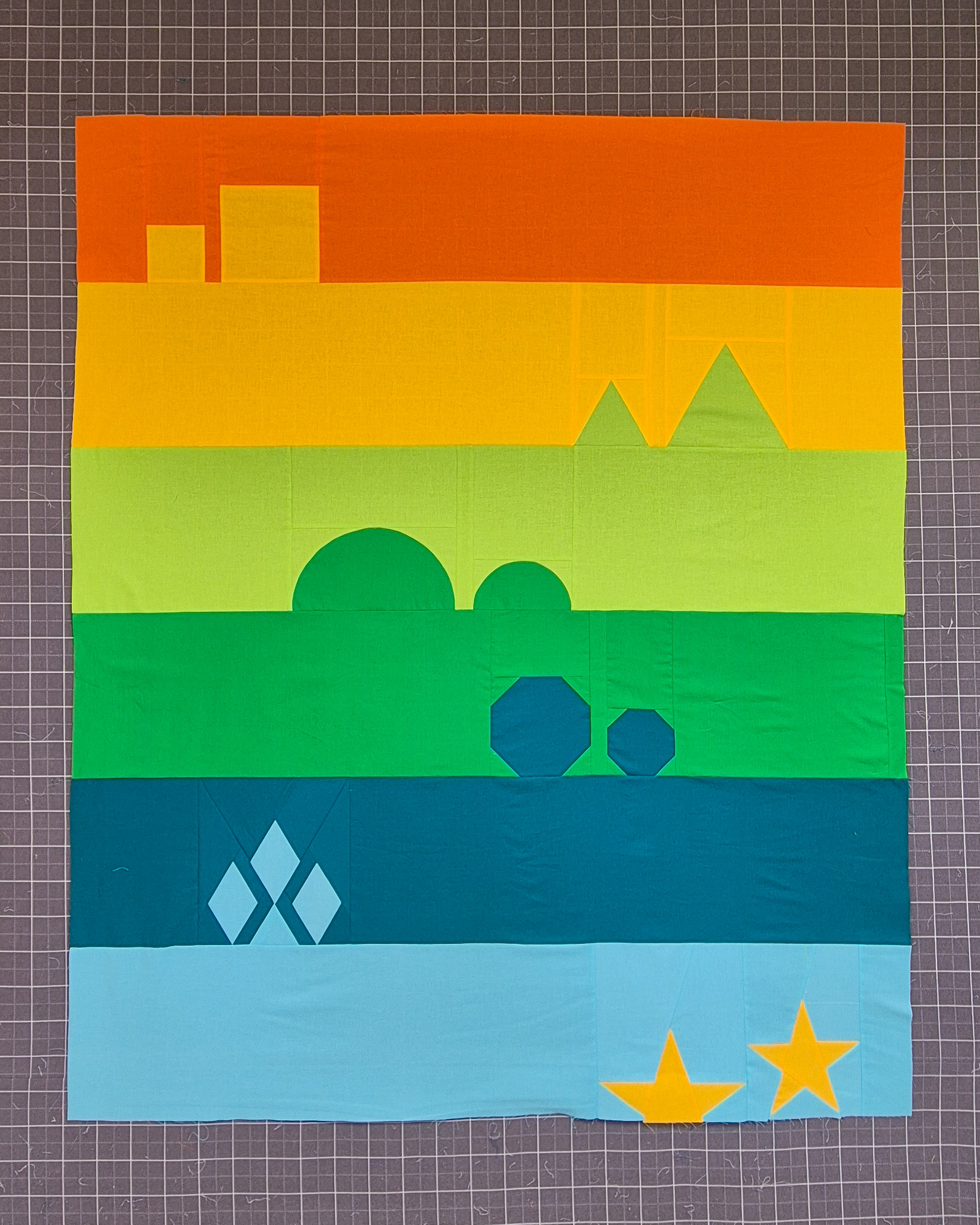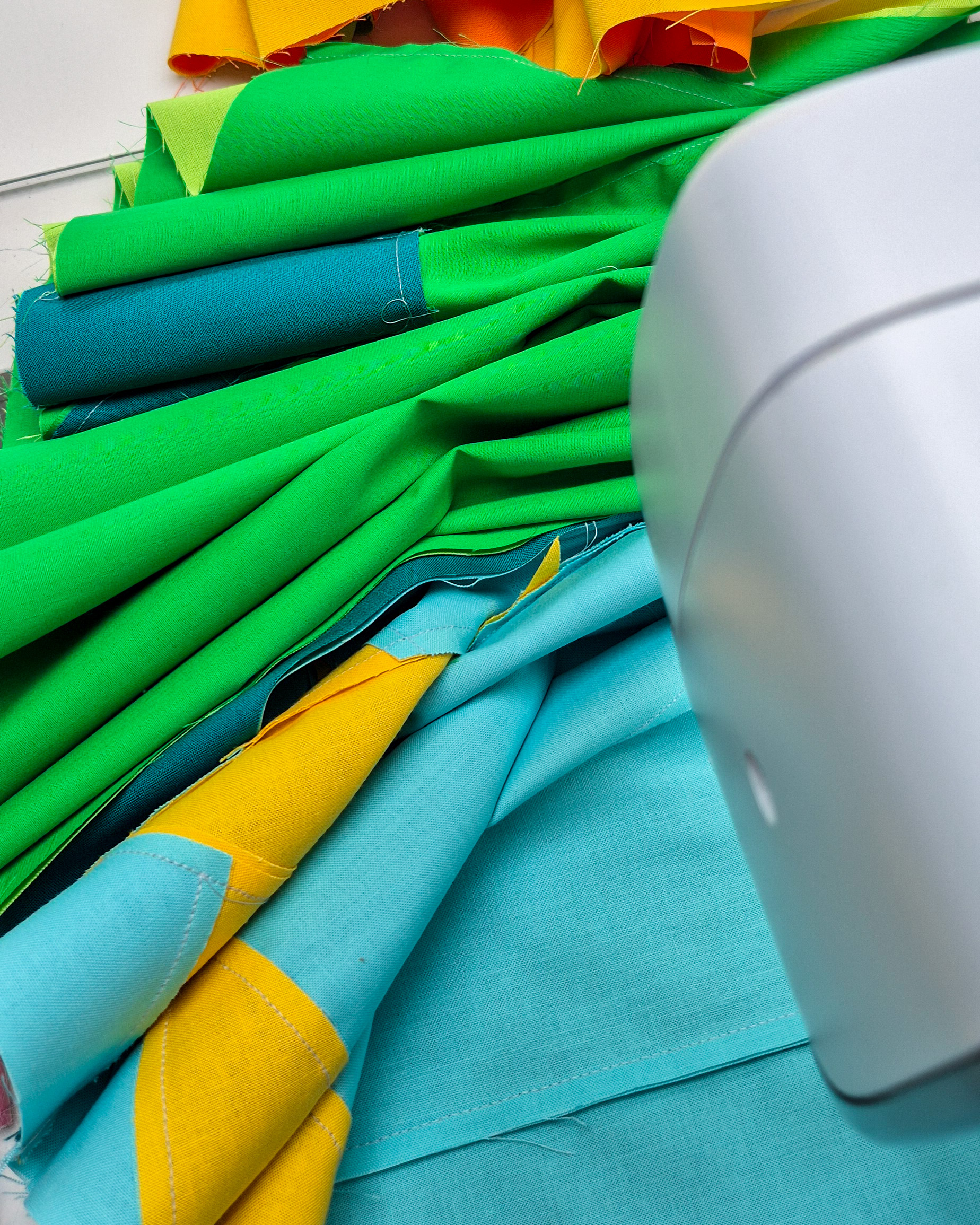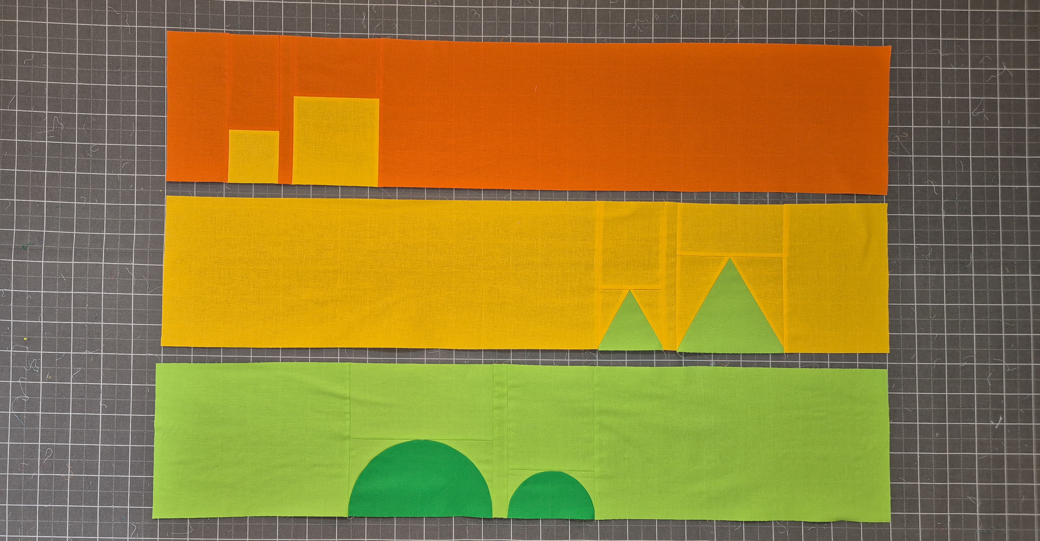 First, we start with sewing the quilt top. We will sew six rows using foundation paper piecing, regular piecing, and quarter circles. For this QAL the quilt top is our canvas, so we are keeping the piecing simple.