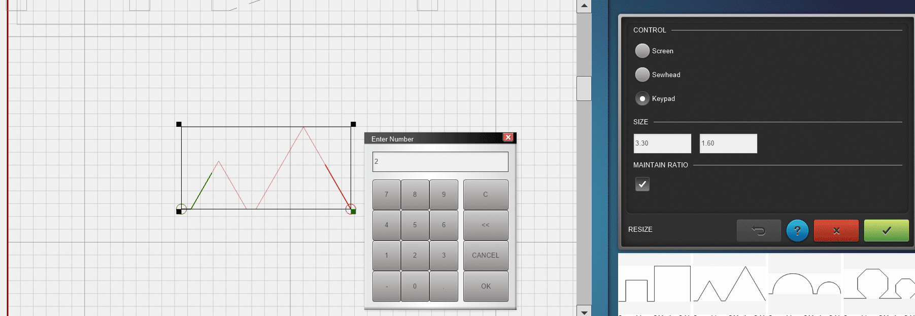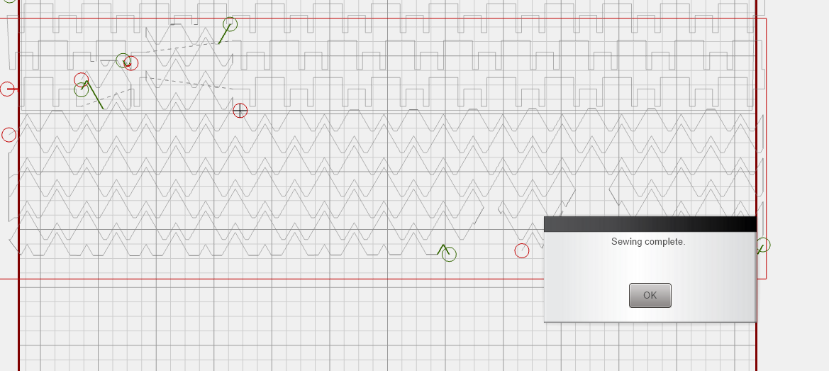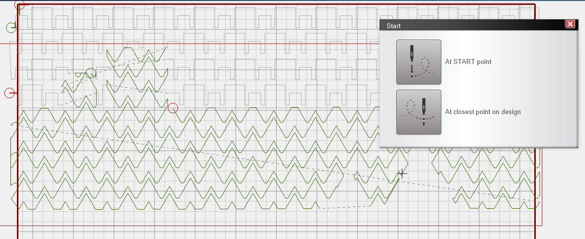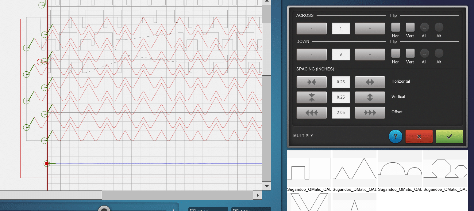 When you are happy with your design, it’s time to hit start. In the image below, you can see the dotted green lines. Those will not be quilted; they represent the travel path of the sew head to connect the different parts of the design.