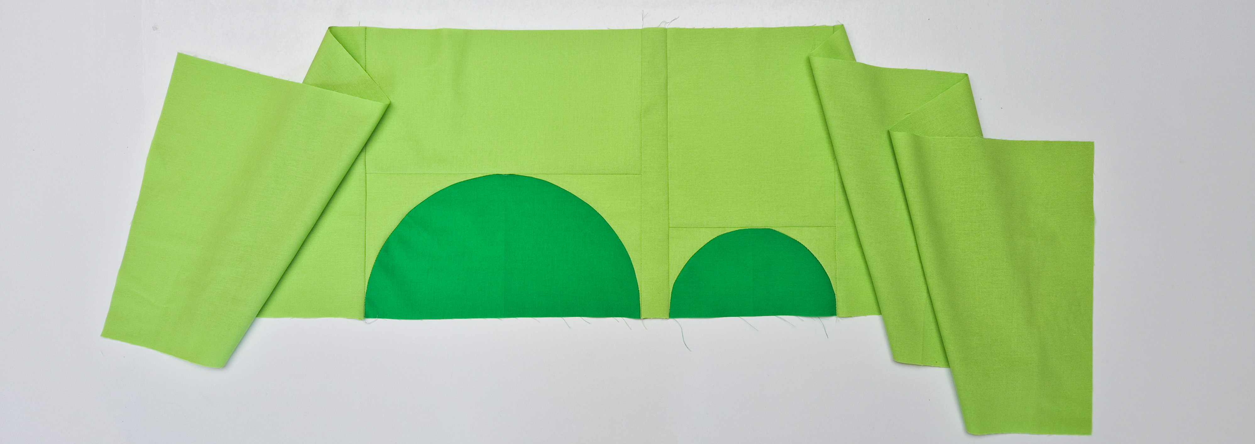 Cut the smaller quarter circle to 3 1/2 x 3 1/2 inch. Cut the bigger quarter circles to 5 1/2 x 5 1/2 inch. (These measurements include seam allowance)