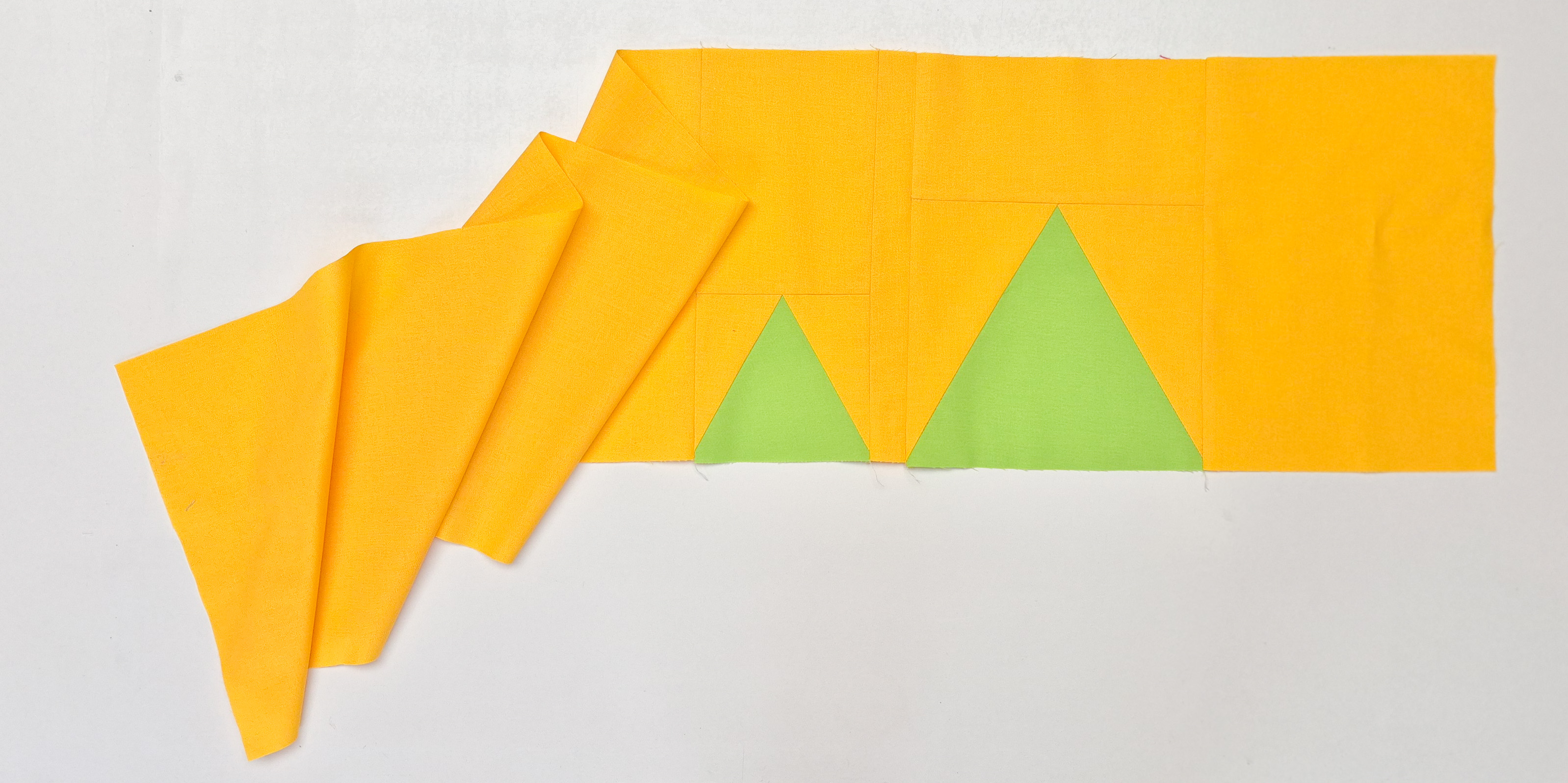 Start by piecing the big and the small triangle blocks from the PDF pattern. The block with the small triangle should measure 5 x 4 1/2 inch. The block with the big triangle should measure 8 x 7 inch.