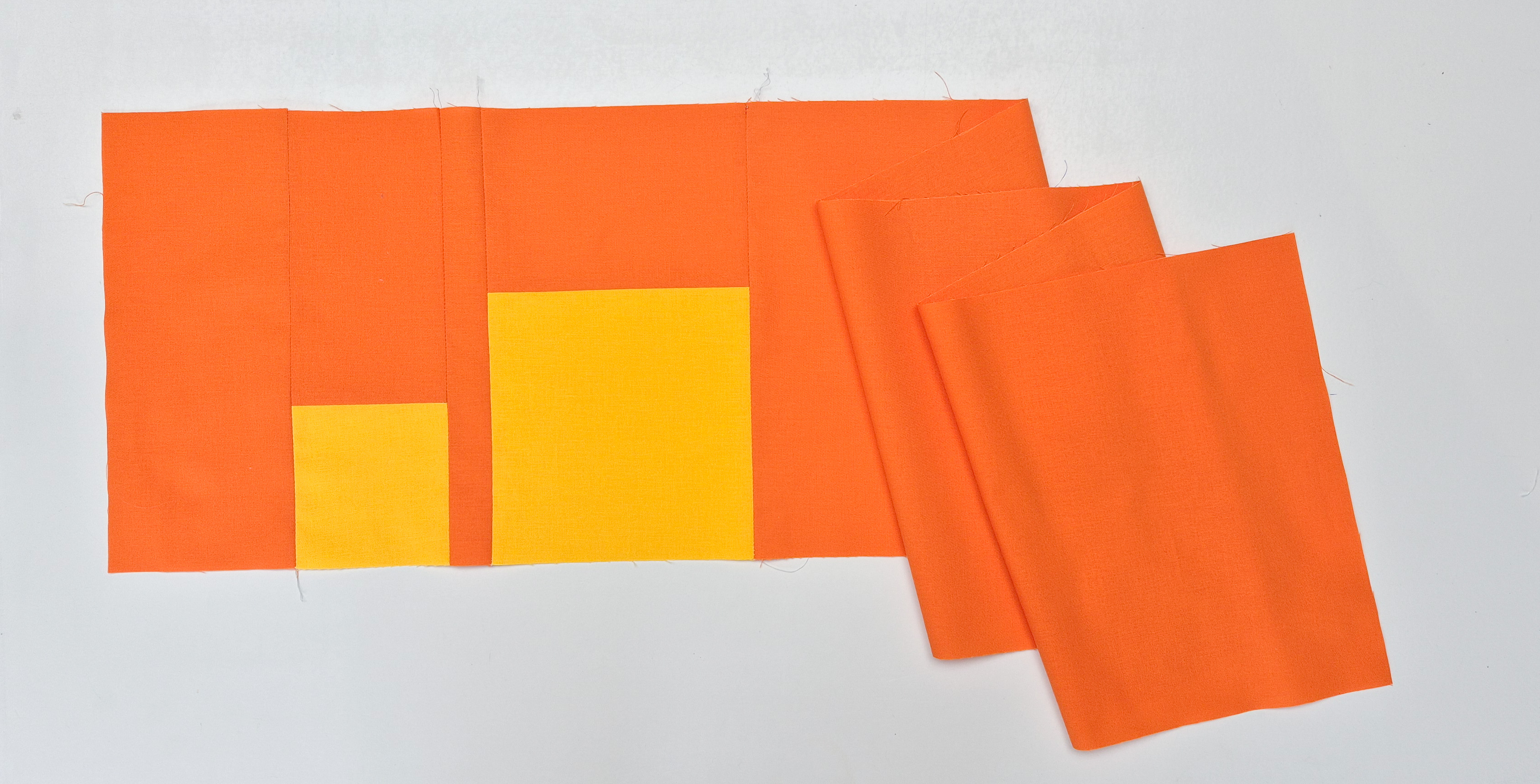 The first row is sewn with regular piecing. Use an inch ruler and a rotary cutter to precisely cut all the pieces from our first fabric. The first row is made with Kona Kumquat and Kona Sunny. You can find a kit for the Quilt Along in my webshop.
