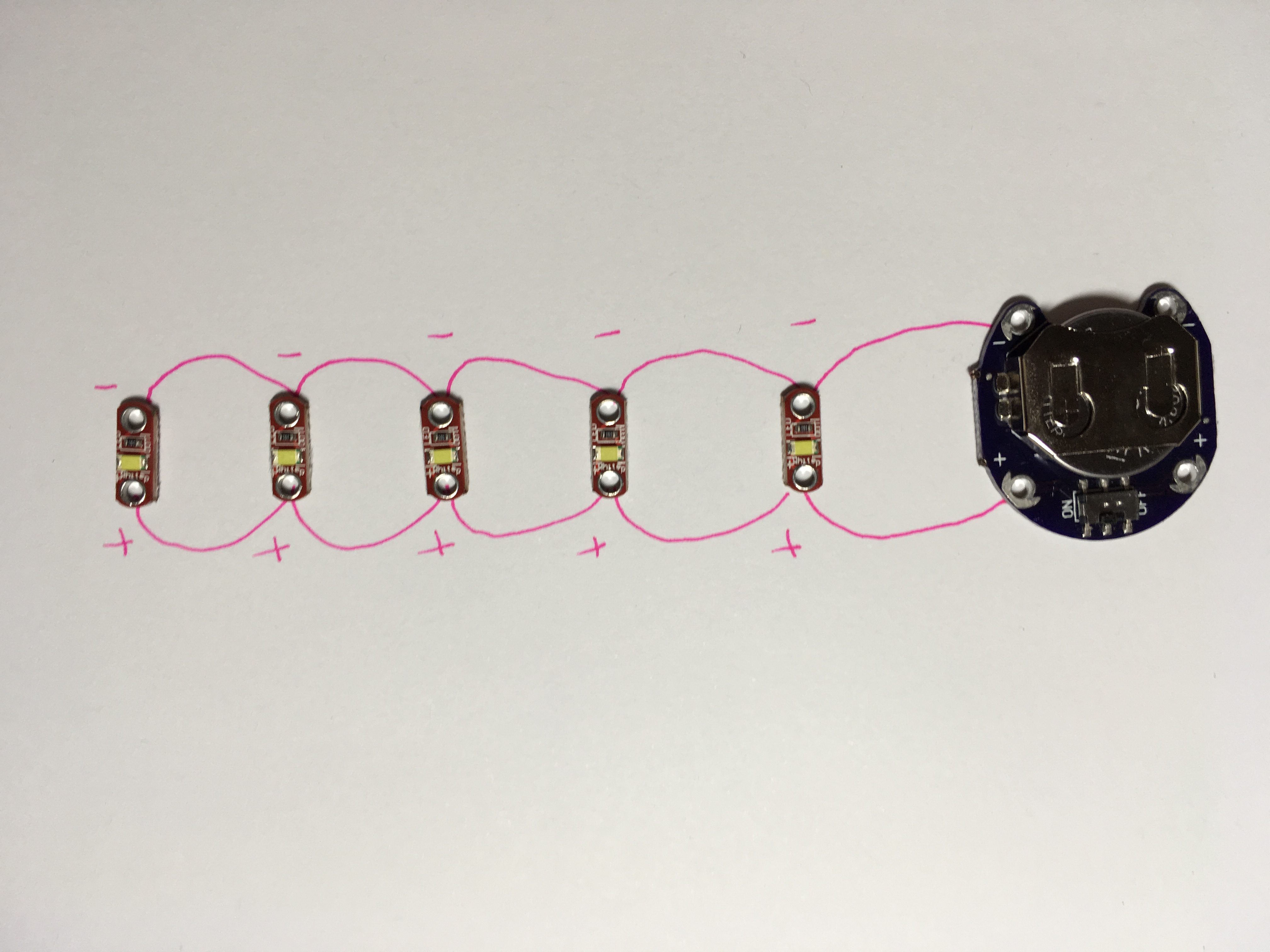 Electricity works by closing a loop from a power source to the LED and then back to the power source. This loop cannot cross at any point, so your stitching must be parallel and never touch. Note: We will not be using any resistors in this project.