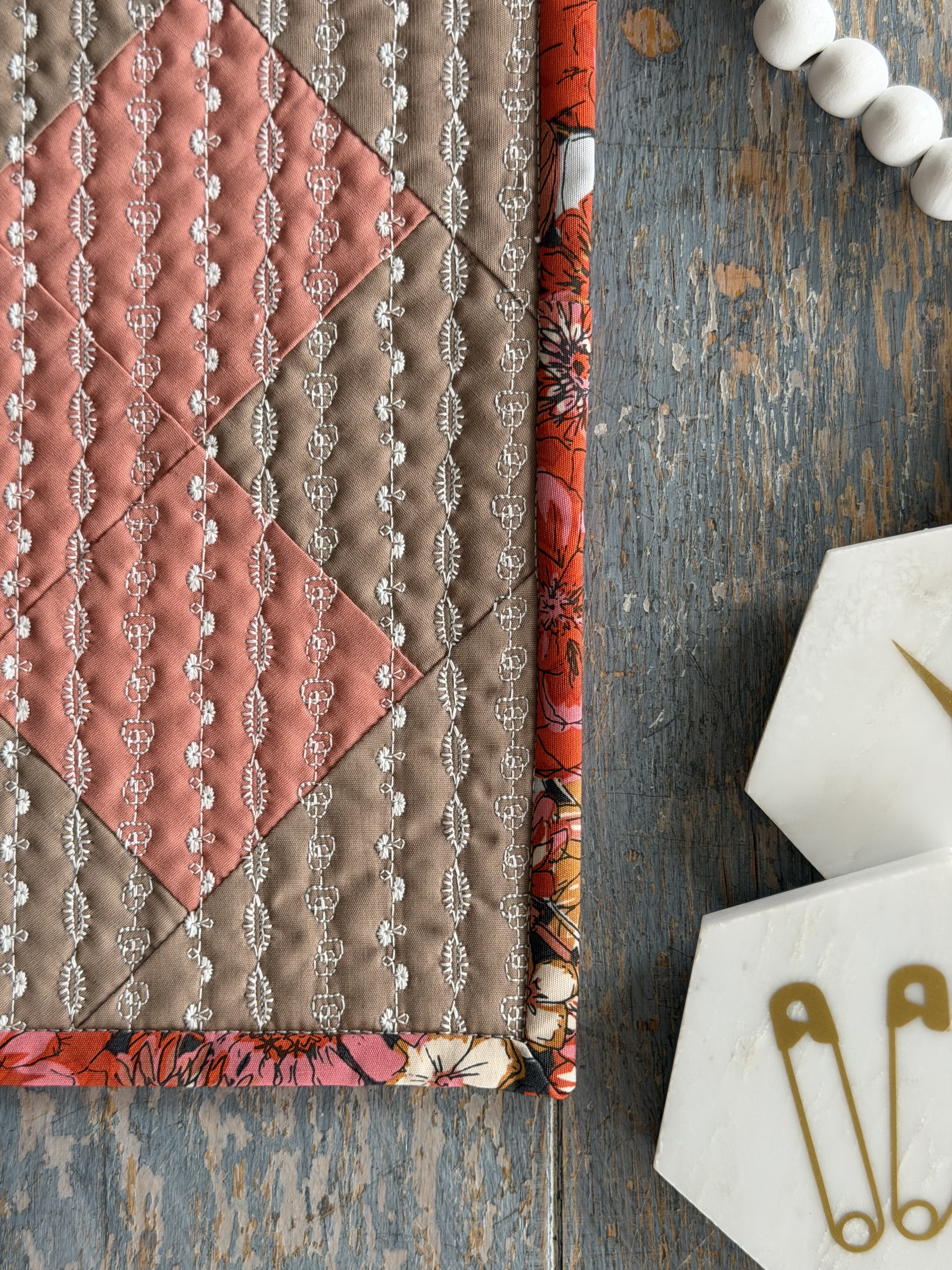 This block focuses on simplicity. Straight stitches and minimal decorative detail keep the eye moving smoothly across the surface. It’s the quilting equivalent of a tidy workspace. Very effortless.