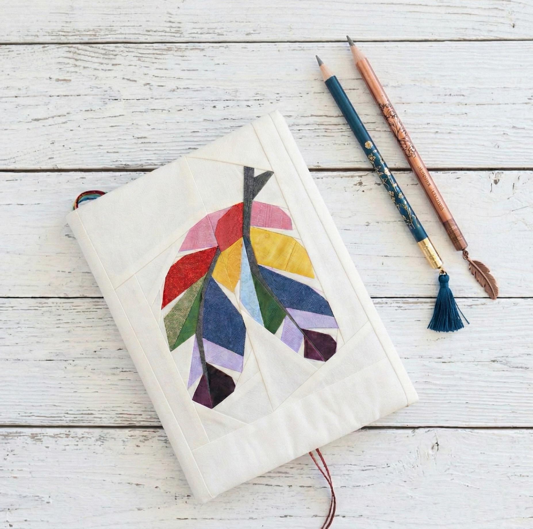 Fabric book cover with feathers quilt block pattern by Joe June and Mae