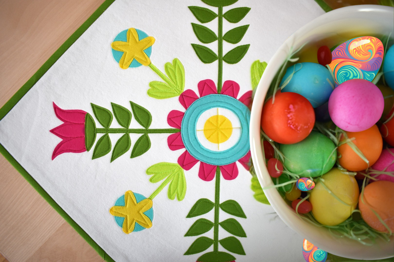 Inspired by simple Scandinavian folk art designs, the Spring Table Topper features a bright bouquet of springtime flowers.